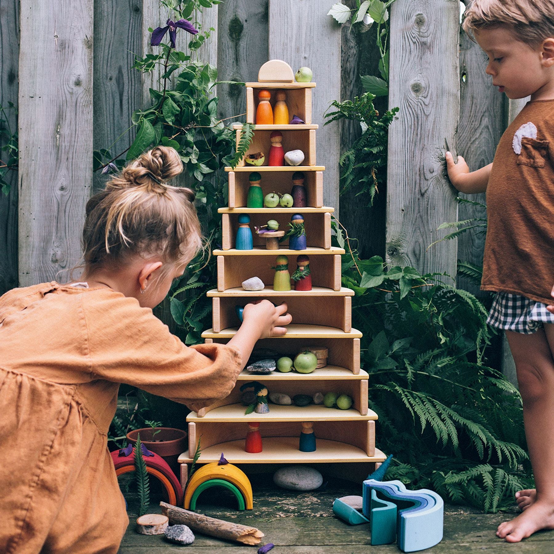 In combination with Grimms Stacking Tunnels or other building blocks one can build inventive and flexible dollhouses. Little architects can experience a versatile and modern Architecture.