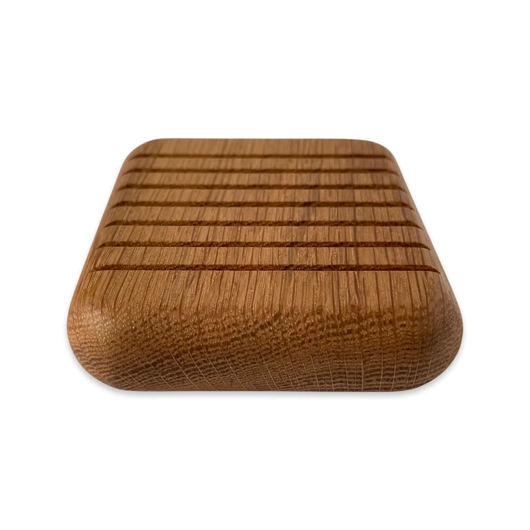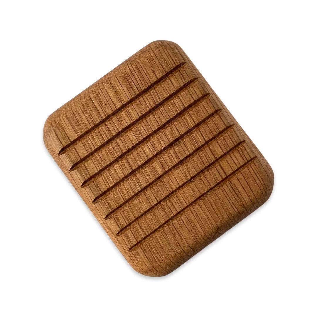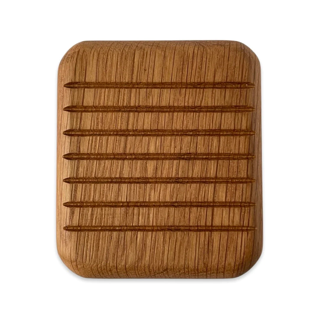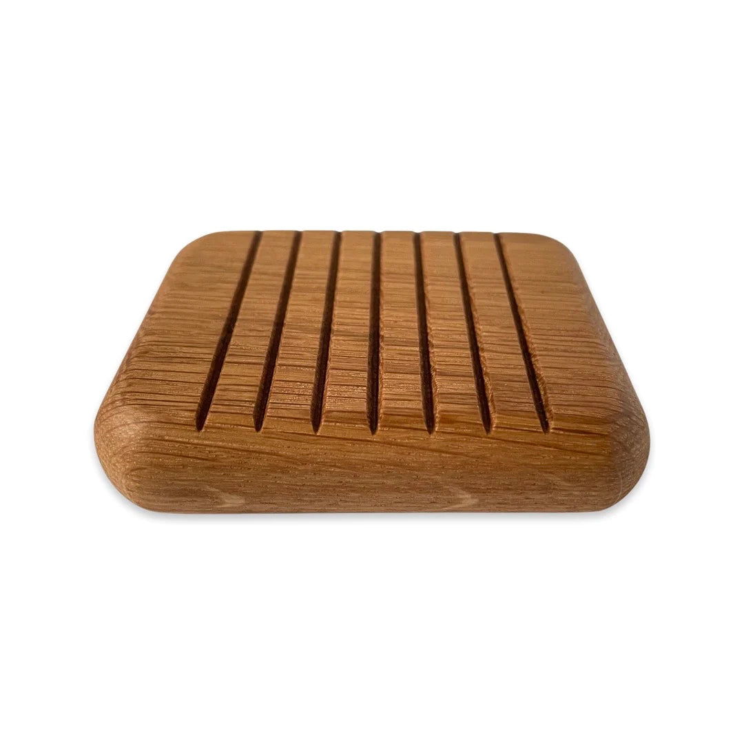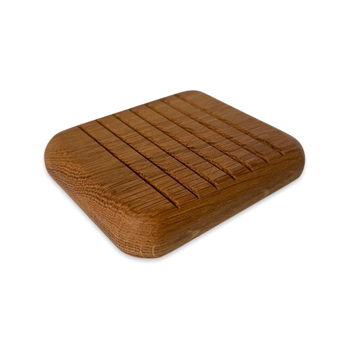 Calderon Madera designed their self-draining dish to perfectly fit a Nablus soap bar. The Palestinian Soap Cooperative also worked with Calderon Madera to design a dish that is maximally resistant to warping and discoloration. Nearly an inch thick and made of old and hard American oak wood, these soap dishes even with the worst care should last at least a decade or more before being considered for gifting to a younger family member or friend or for tossing in the compost pile.