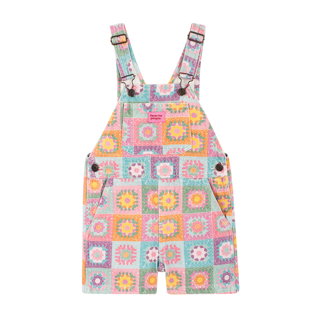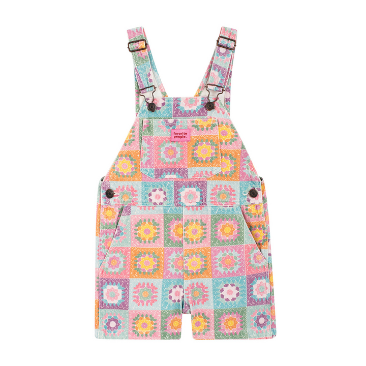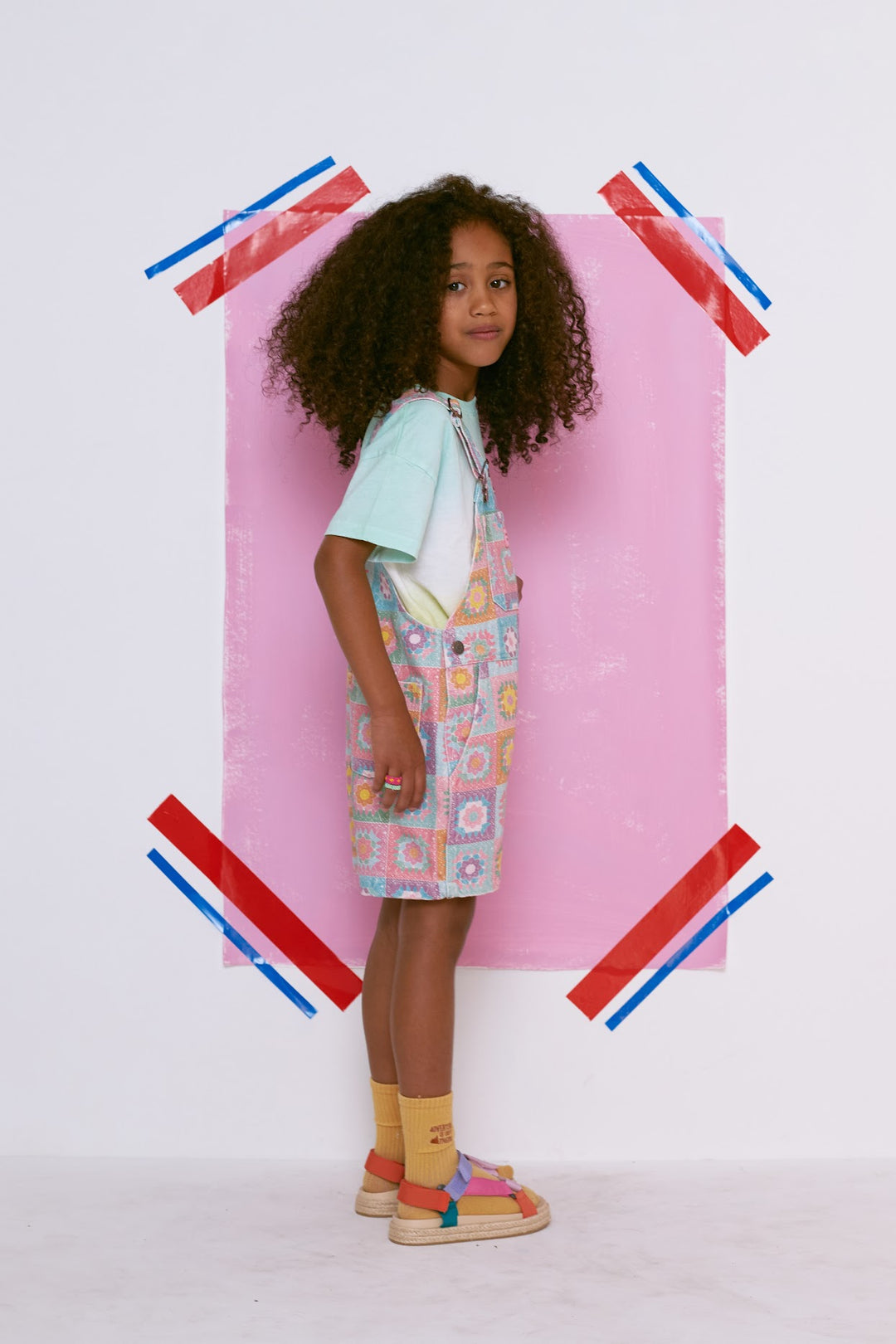 Short overalls with color print, a straight neckline and adjustable straps with dungarees closure. Combined pockets on the front, kangaroo-style on the bib and patch pocket on the back. Closure with buttons on the sides.