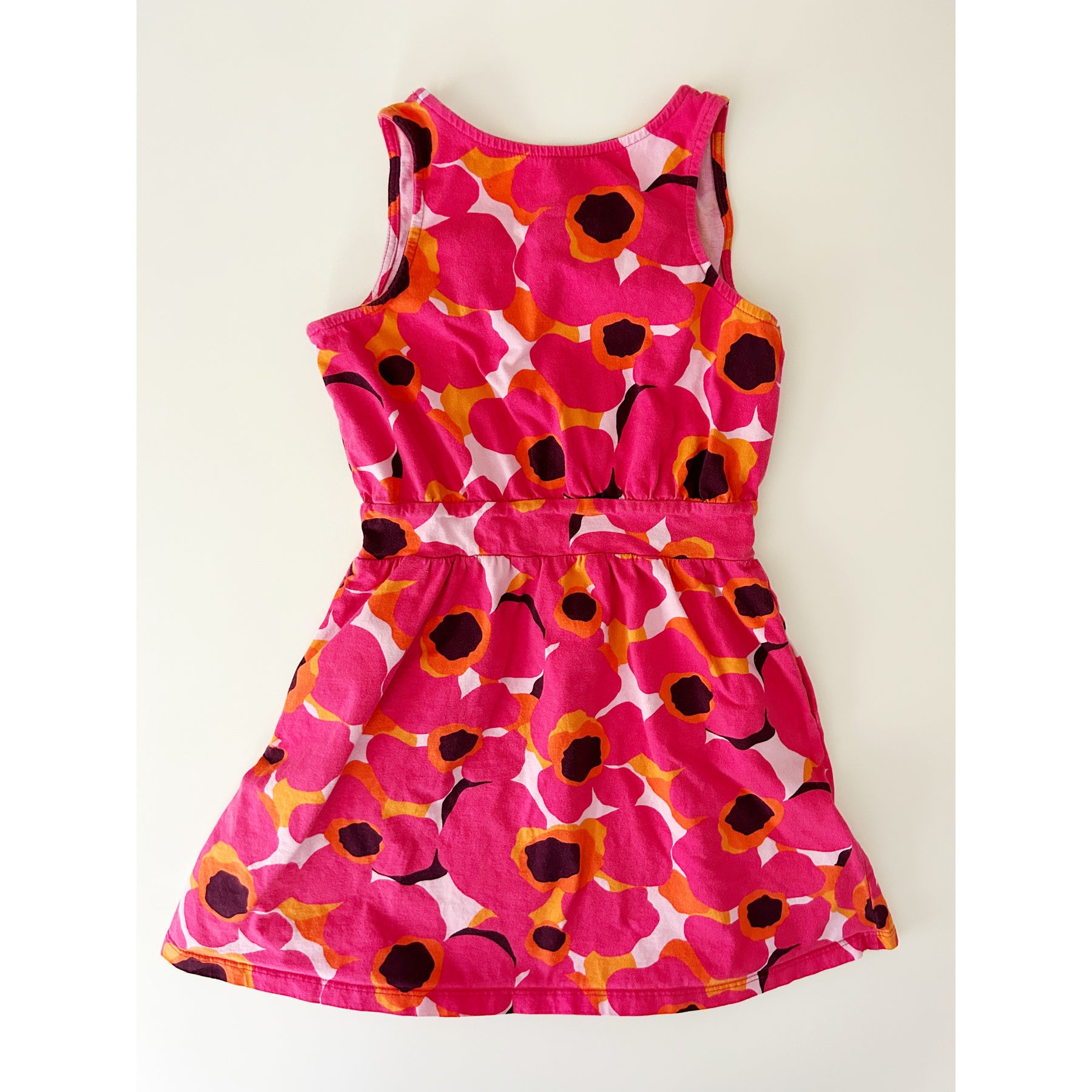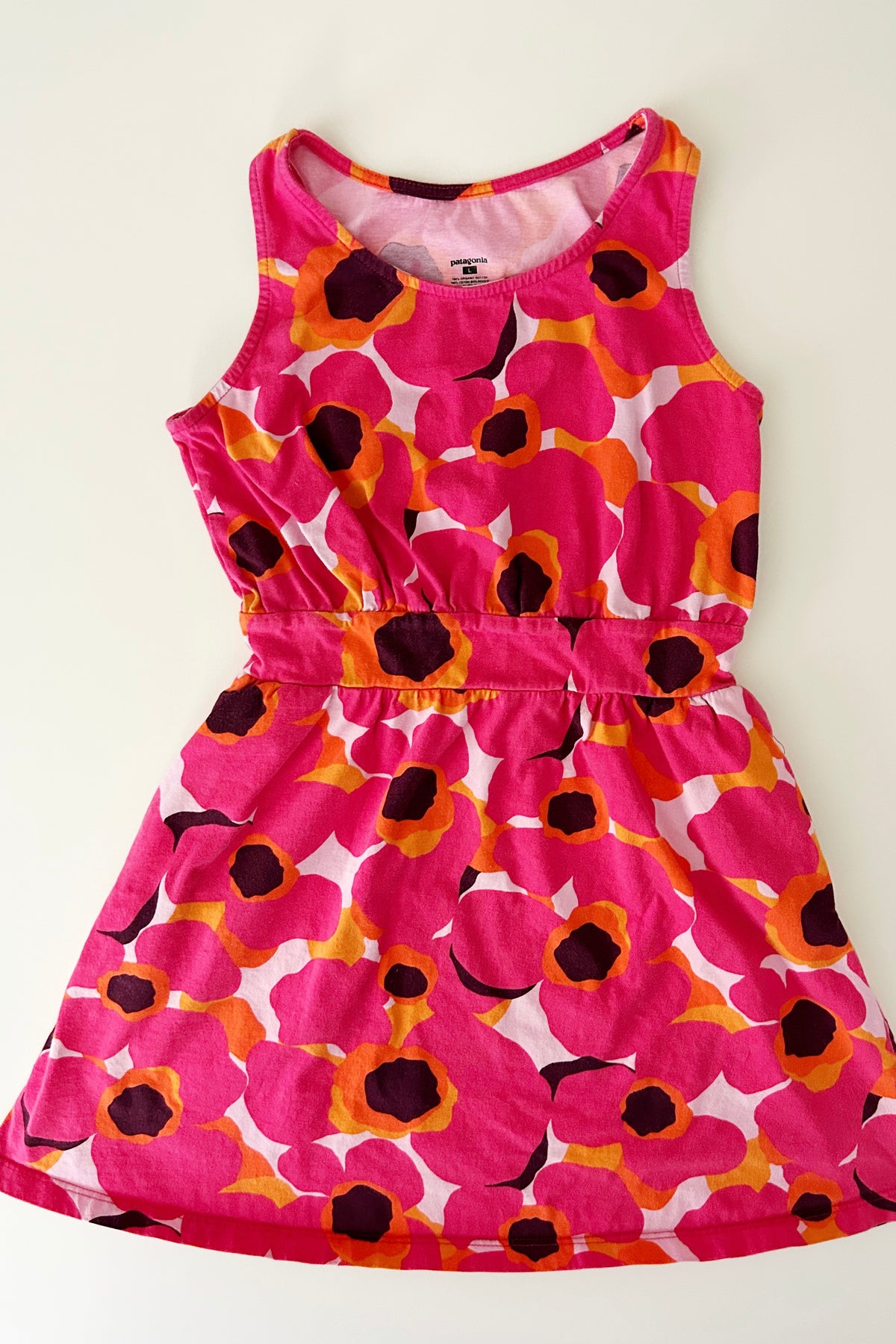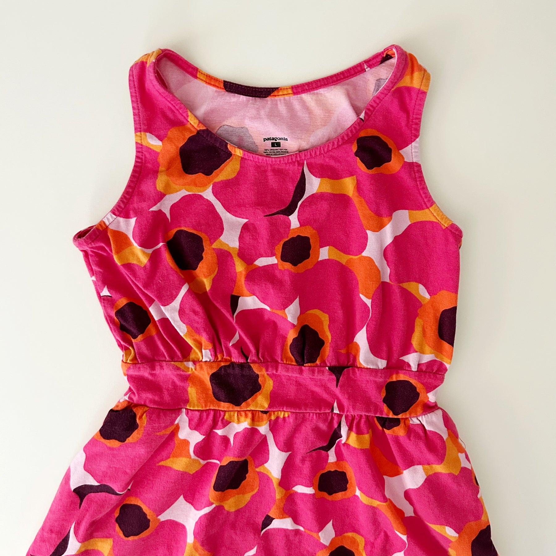 Pink, orange, and brown floral pattern tank dress from Patagonia. Size 12 -- please see measurements (29" length, 15.5" pit-to-pit). Good used condition with light wash wear.
