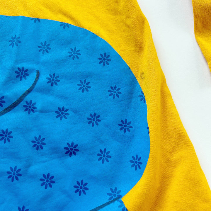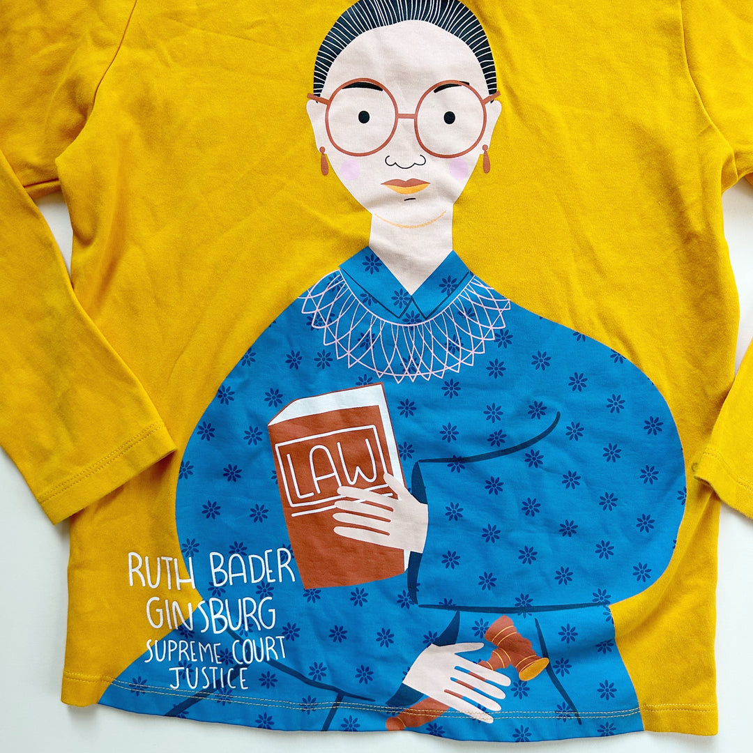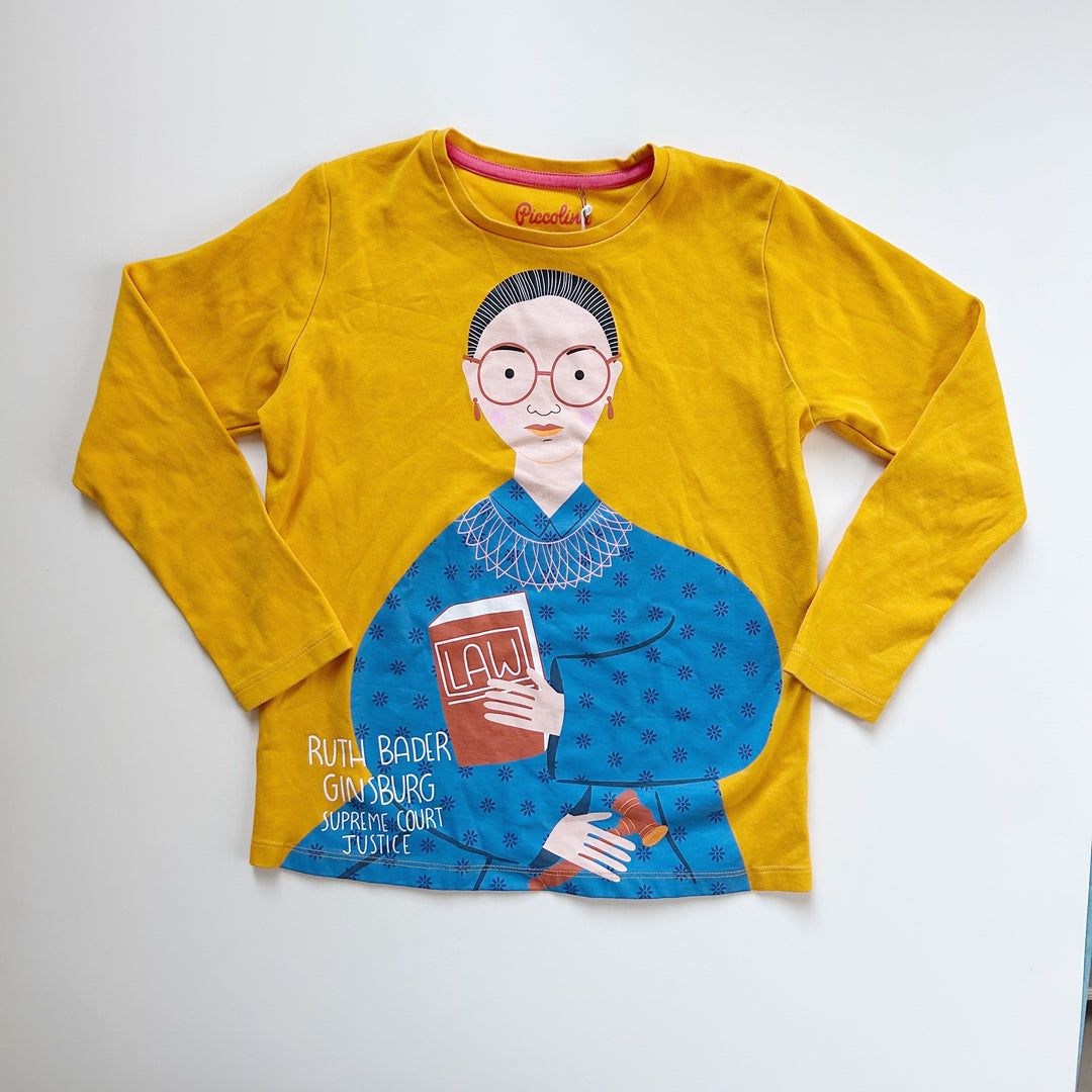 Yellow long sleeve top from Piccolina with Ruth Bader Ginsburg graphic across front. Good used condition with light wear. 100% cotton. Size 10 -- please see measurements (20.5" length, 16" pit-to-pit)