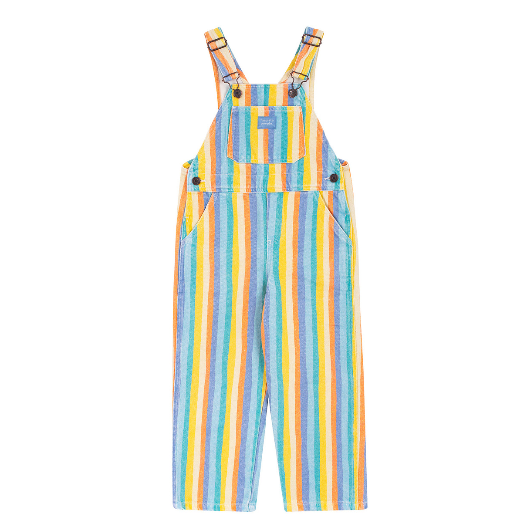 Long overalls with color stripes print, a straight neckline and adjustable straps with dungarees closure. Combined pockets on the front, kangaroo-style on the bib and patch pocket on the back. Closure with buttons on the sides.
