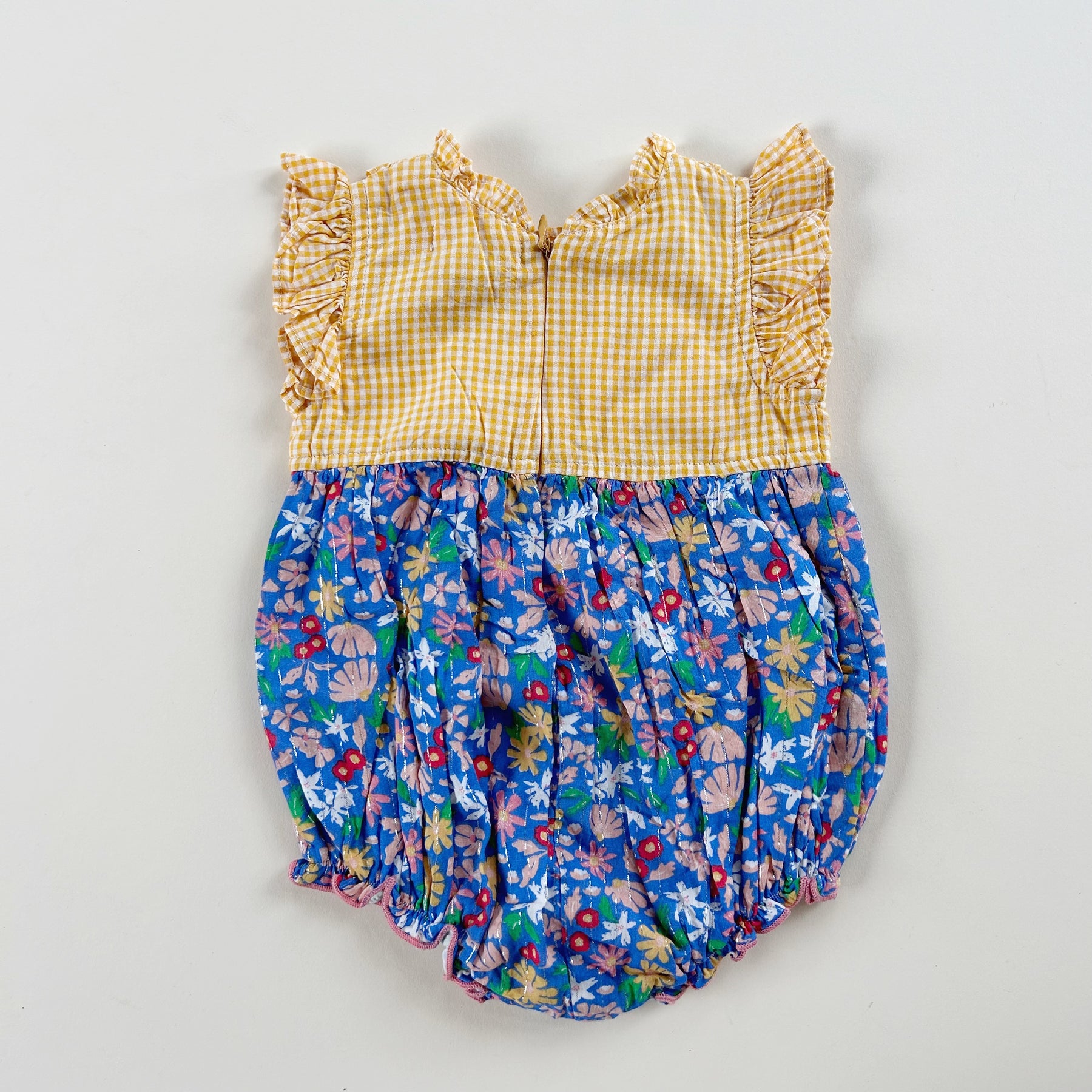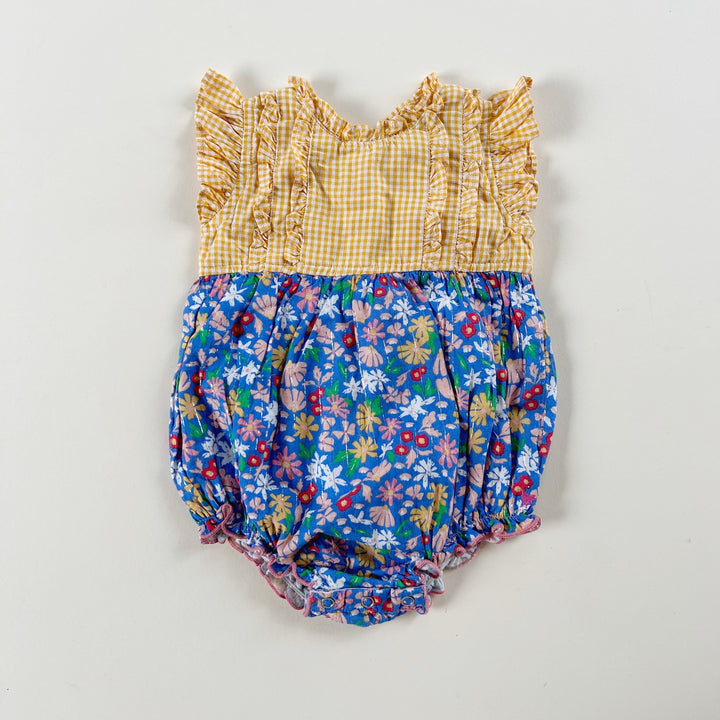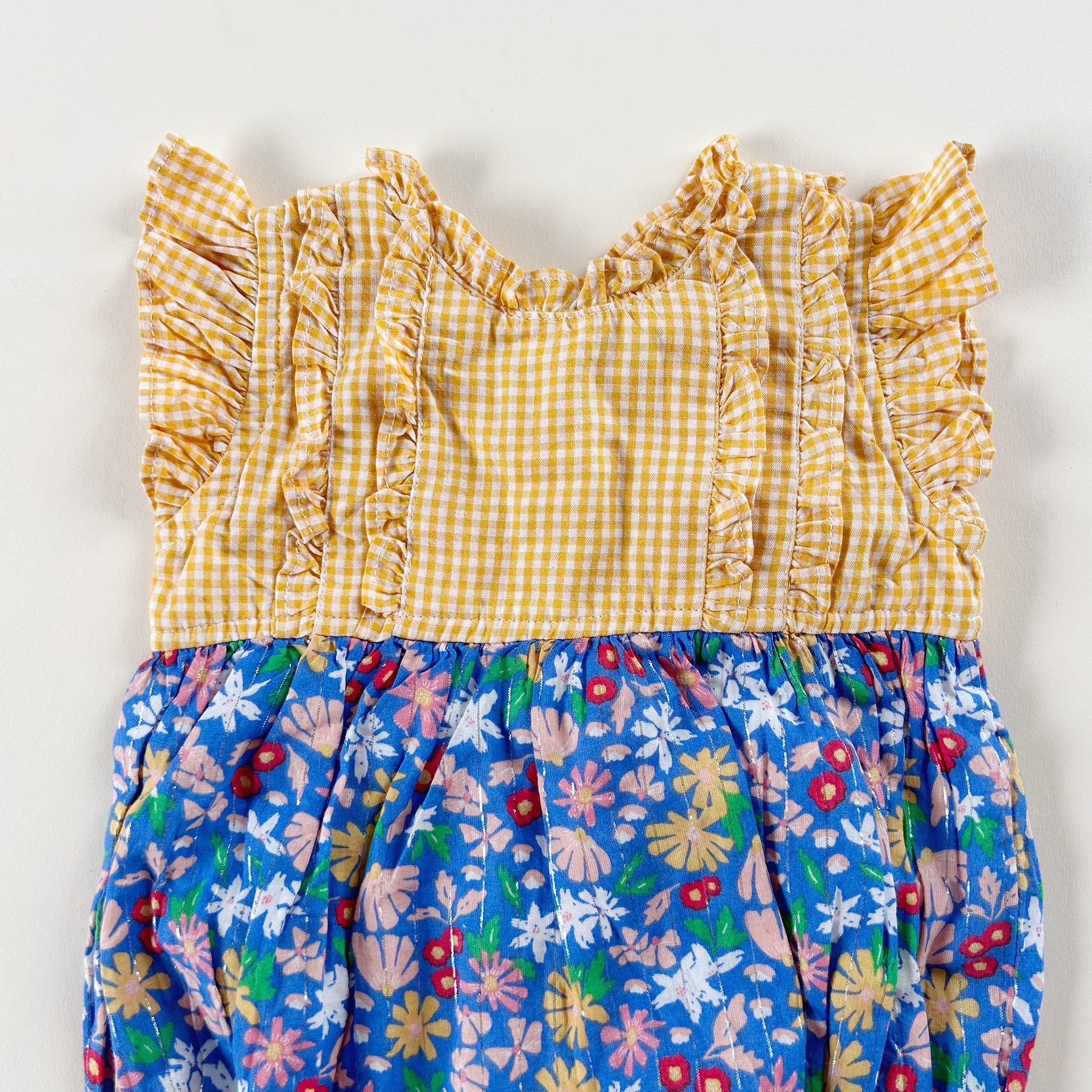 Floral romper from Pink Chicken. Orange/white gingham ruffle top with blue floral pattern bottom. New with tag.