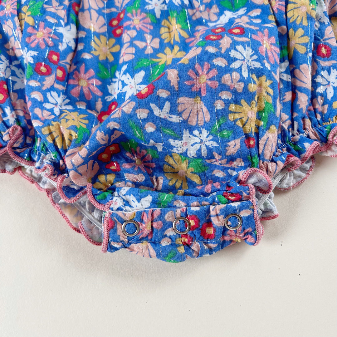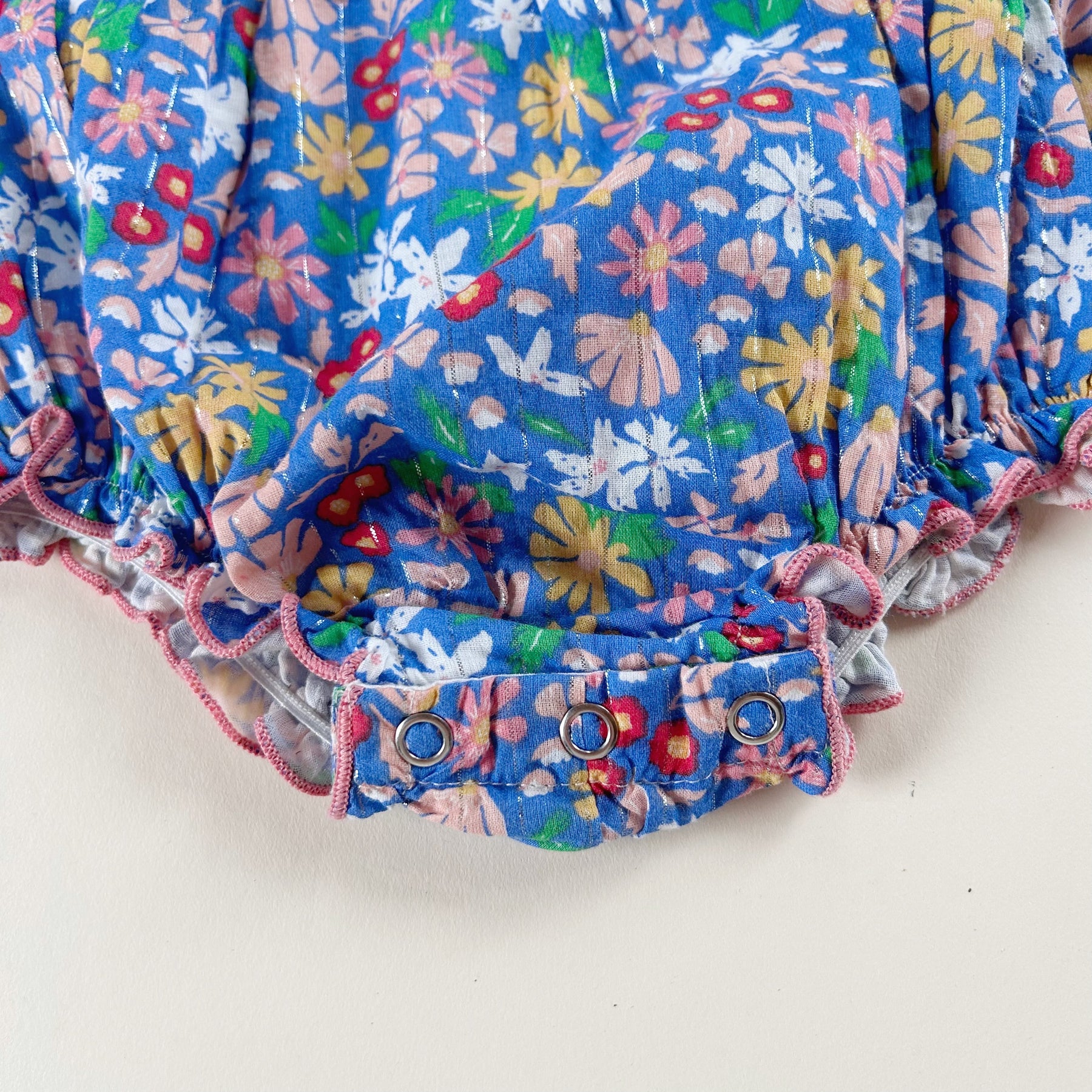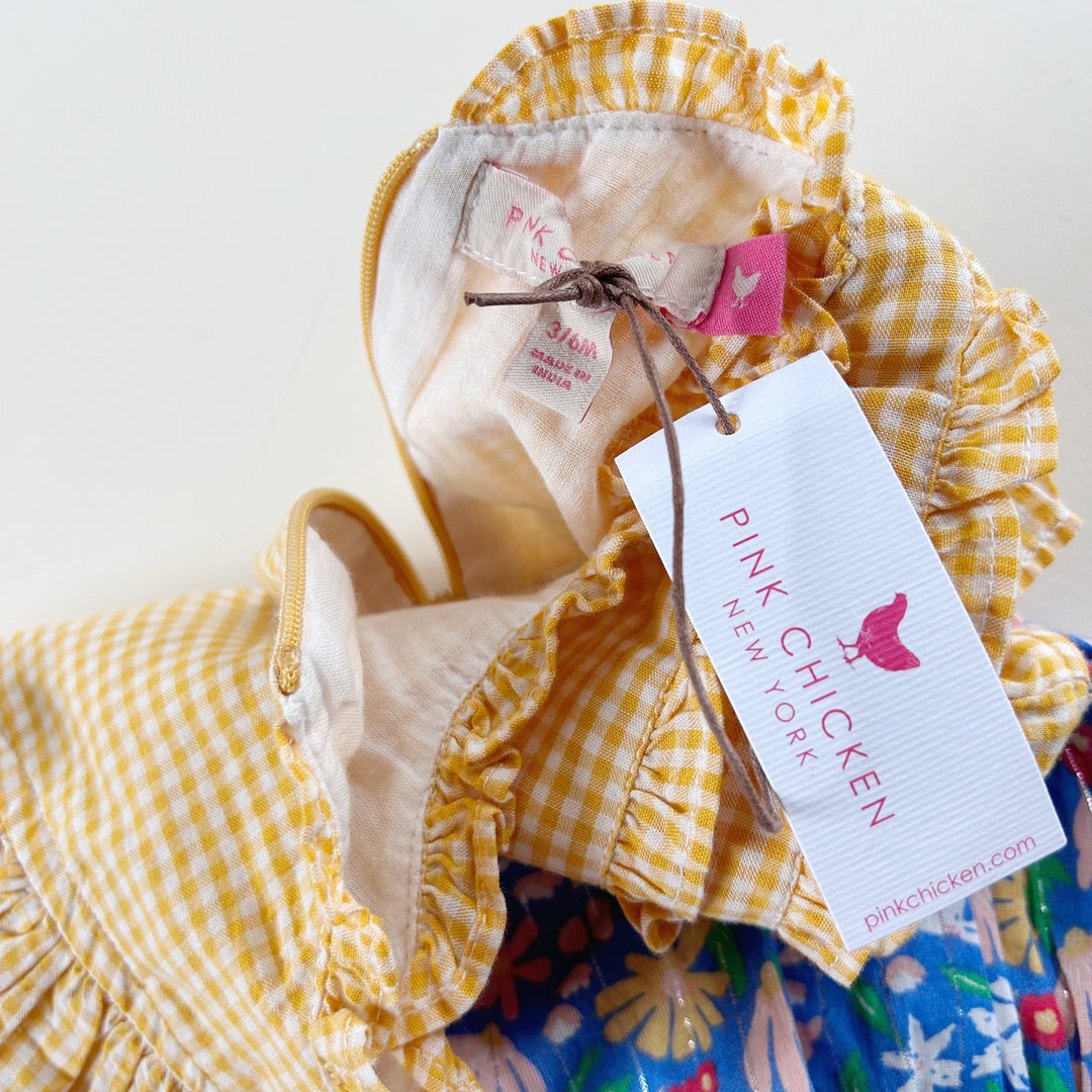 Floral romper from Pink Chicken. Orange/white gingham ruffle top with blue floral pattern bottom. New with tag.