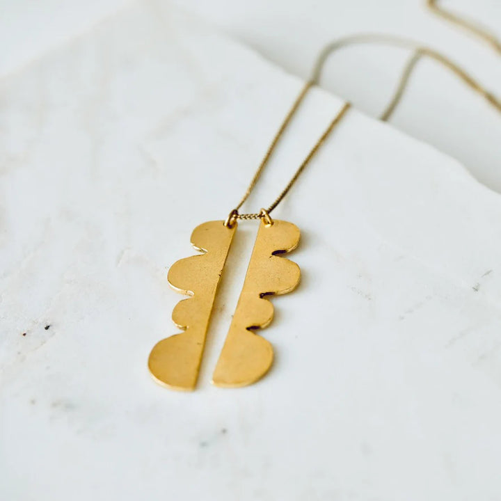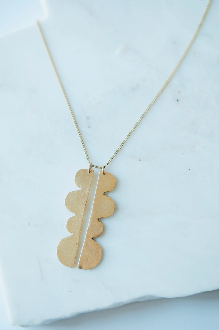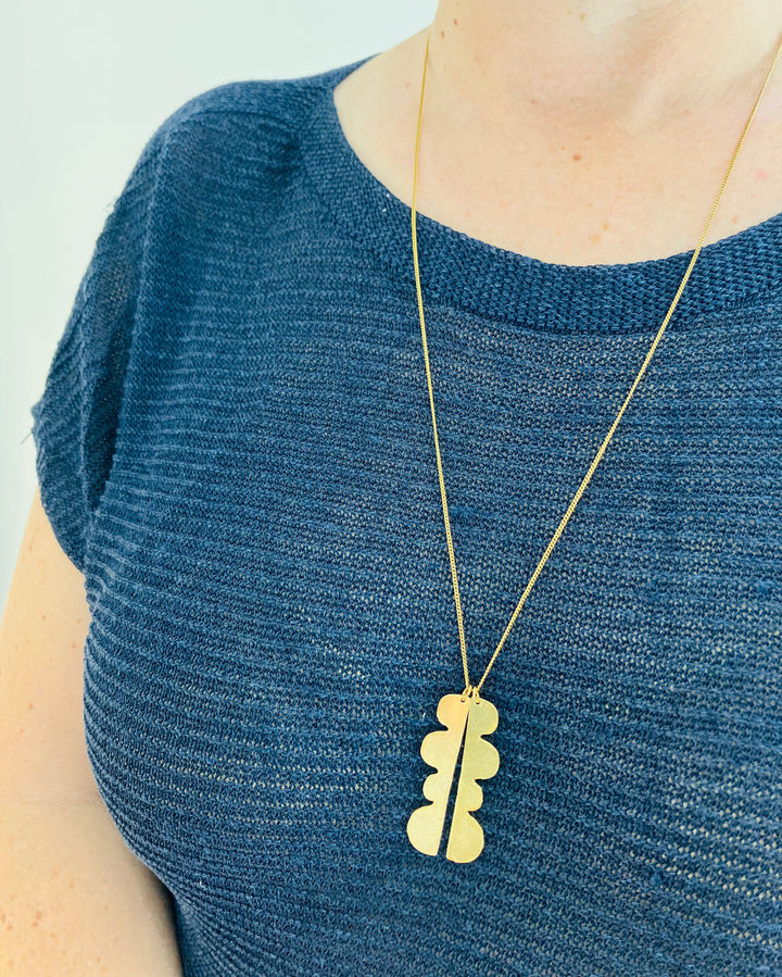 Hand fabricated gold plated pendants hang on a gold plated chain.