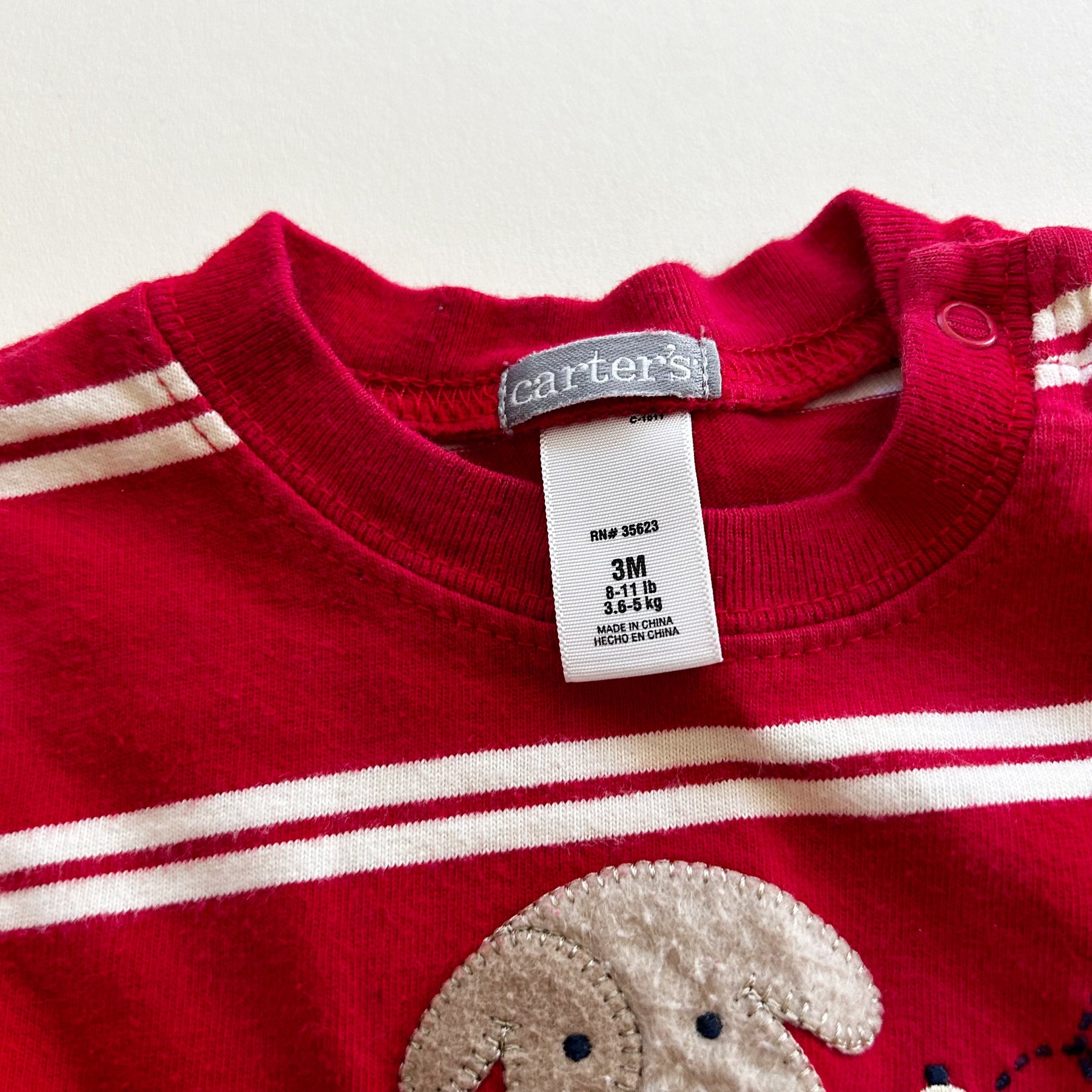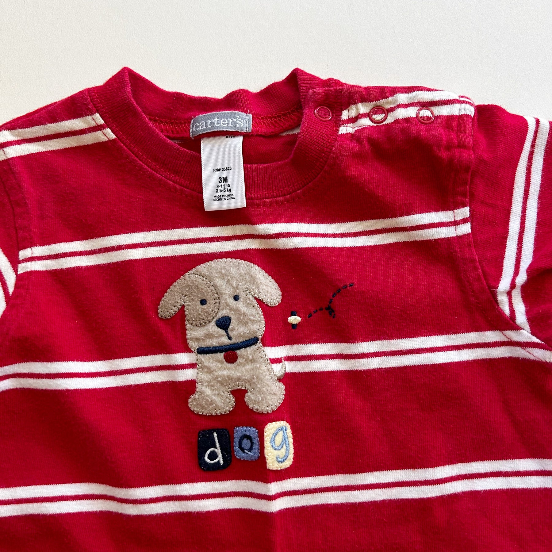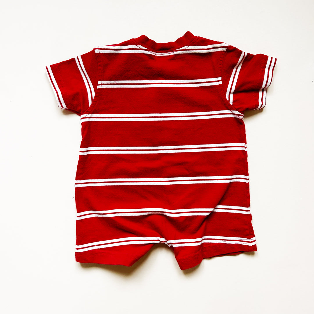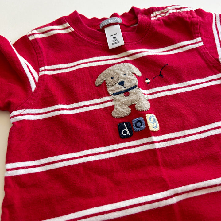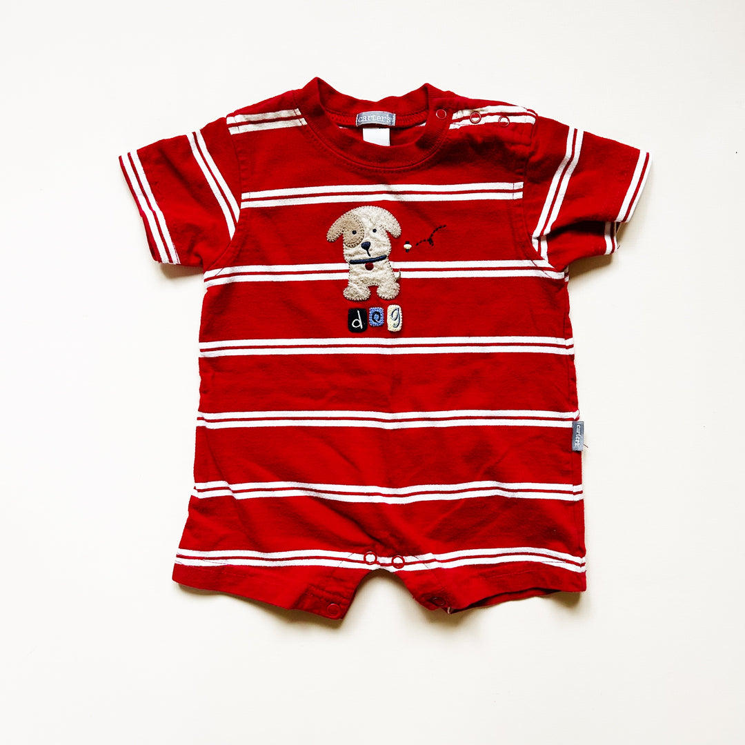 Retro red striped romper from Carter's with dog appliqué across front. Good used condition with light wear. Size 3 months (measurements available upon request)