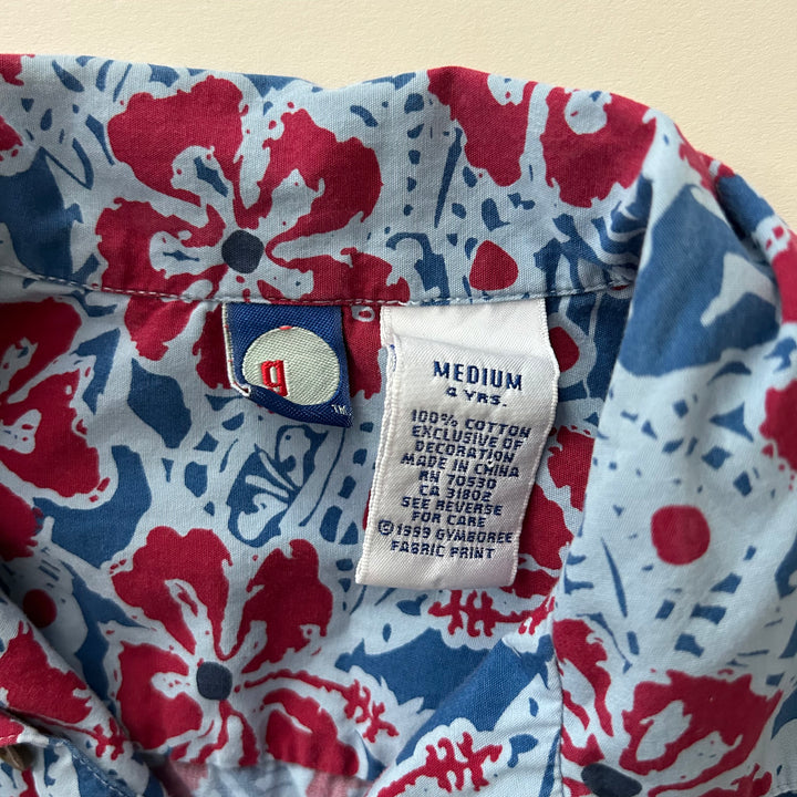 Retro red and blue tropical floral pattern button down from Gymboree (early 00s). Good used condition with light wear. Size 4 -- please see measurements (17.5" length, 15.5" pit-to-pit). 100% cotton.