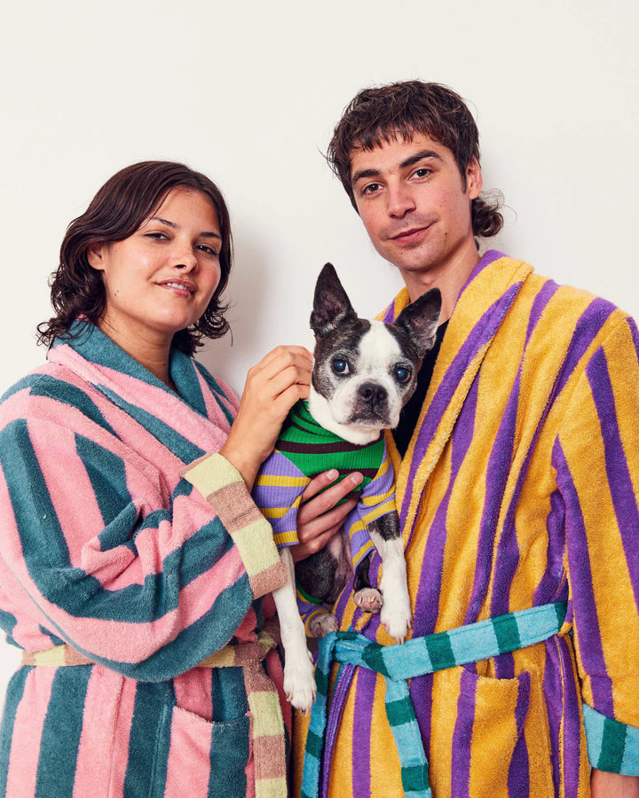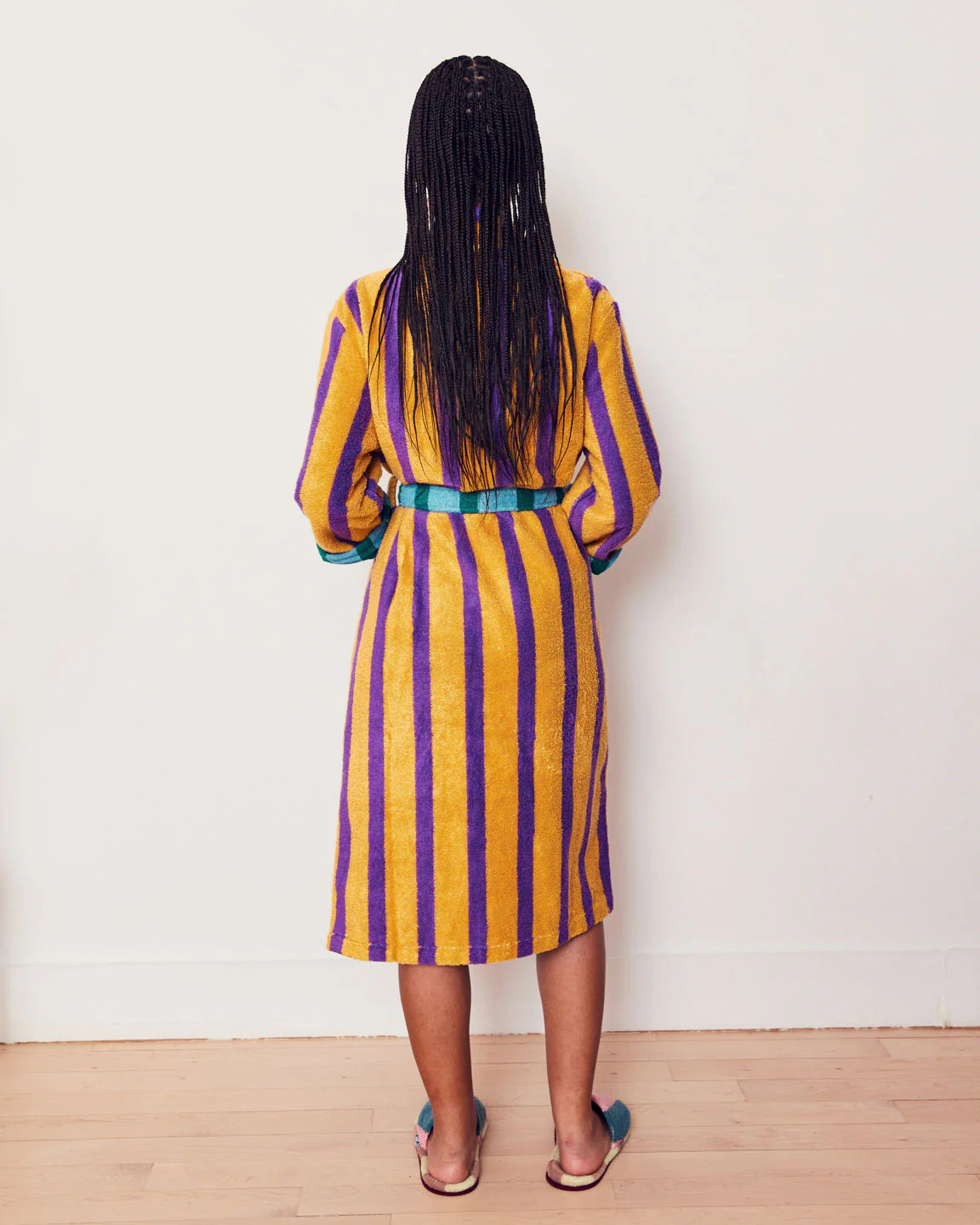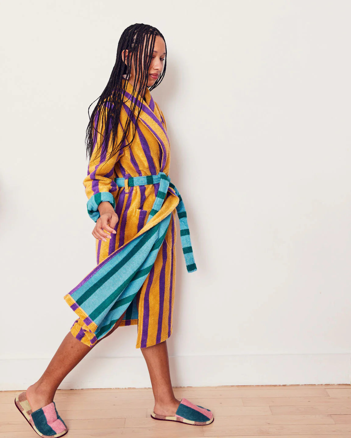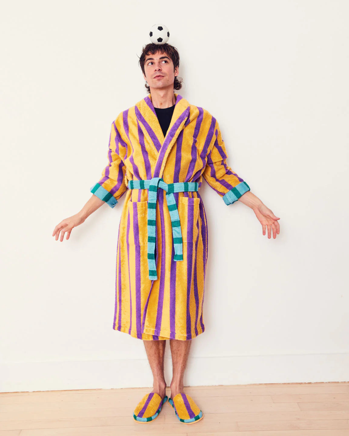 Cotton terry bathrobe with shawl collar, patch pockets, and tie. Contrasting stripes and colorways on both sides. 95% cotton terry, 5% polyamide, 430 GSM. This item is Oeko-Tex Standard 100 certified (no harmful chemicals were used during production). Made in Portugal.