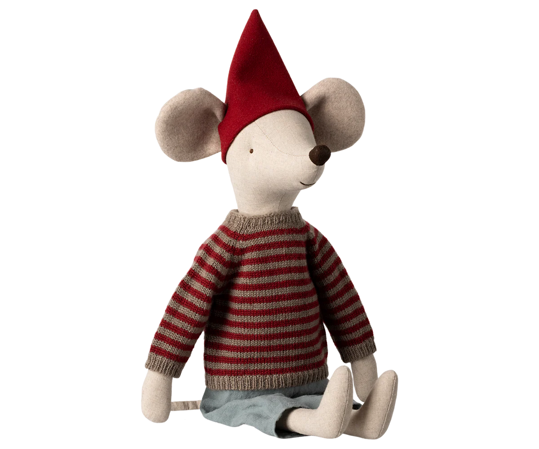 This mouse in size maxi wears festive Christmas clothes - the ears are made in extra thick fabric to keep them warm