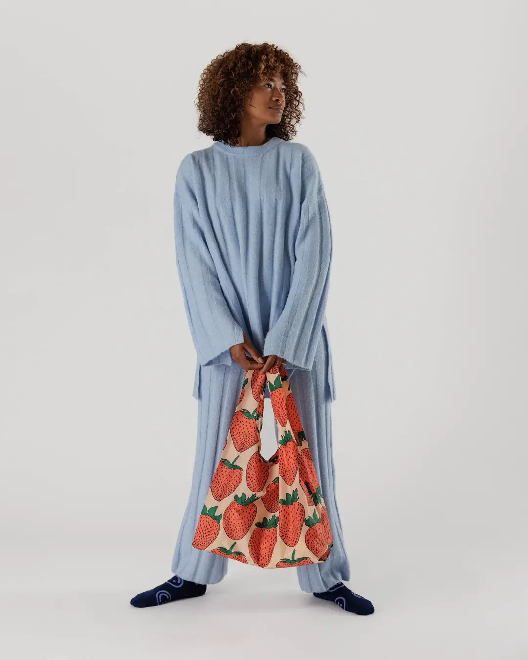 • Carries 2-3 plastic grocery bags worth of stuff comfortably in hand or over your shoulder