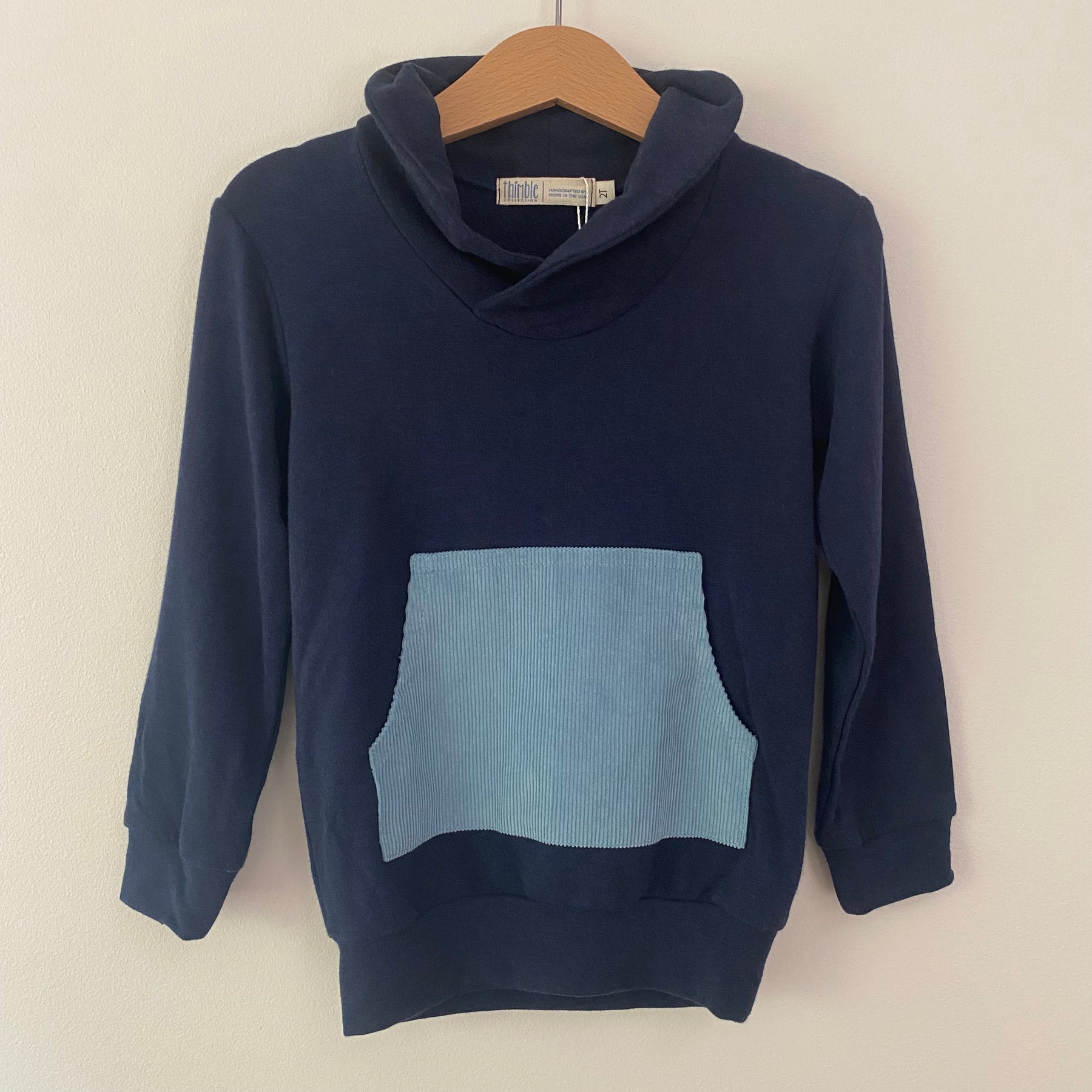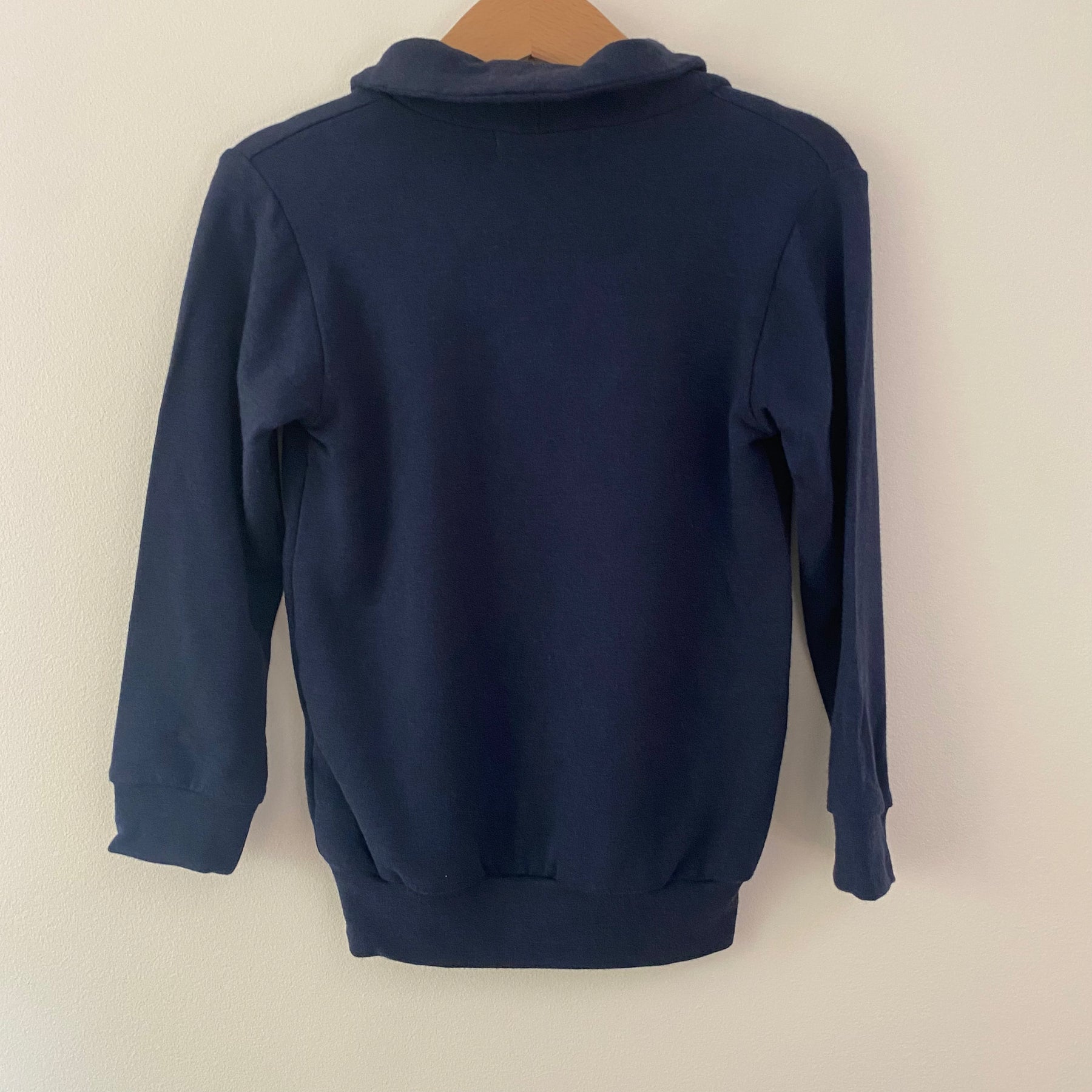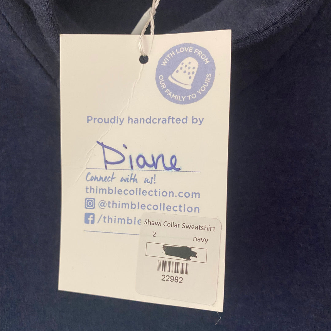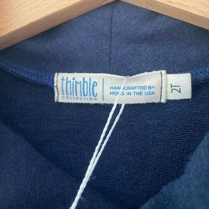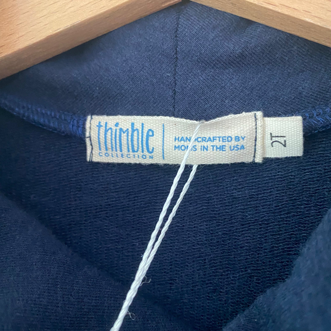 New with tag Thimble Collection shawl collar sweatshirt in navy. Size 2T (17.5" length, 12" pit-to-pit). Made in USA.