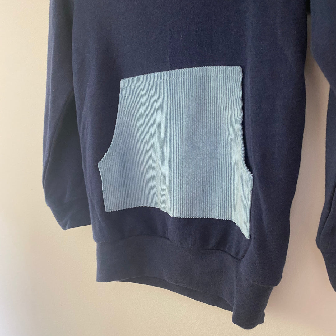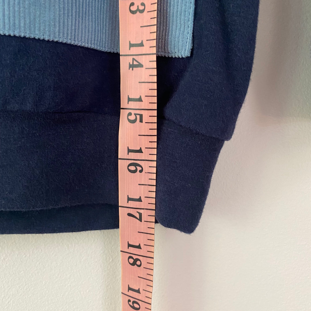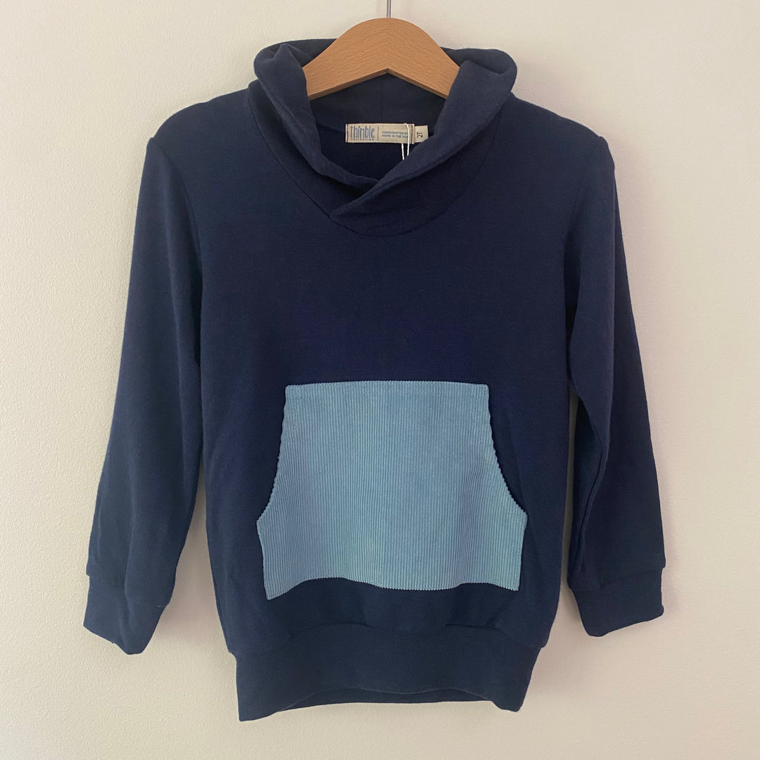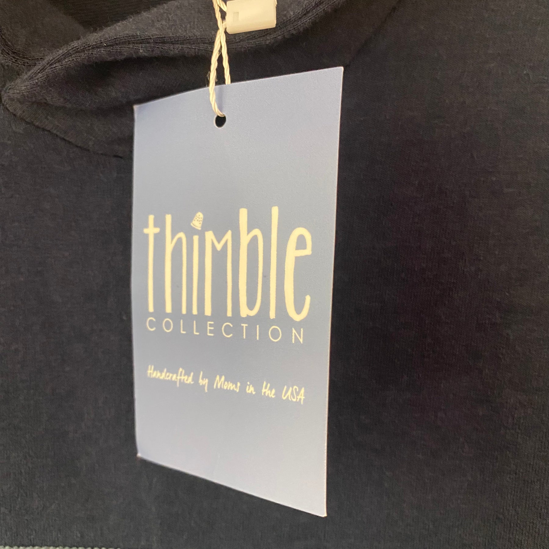 New with tag Thimble Collection shawl collar sweatshirt in navy. Size 2T (17.5" length, 12" pit-to-pit). Made in USA.