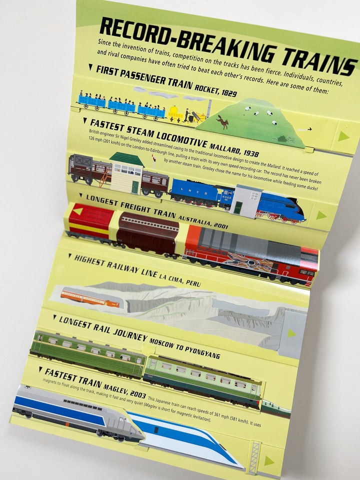 Have you ever wondered how a steam engine works? Do you have a hankering to don an engineer's cap and race a locomotive under tunnels and over bridges? Loaded with flaps, pull-tabs, 3-D trains, and a spectacular pop-up model of a bustling railroad station, Robert Crowther's sturdy exploration of trains and how they work is a tour de force of paper engineering and a bonanza for railroad aficionados of all ages. What's more, it's filled to the brim with fun facts and intriguing information lurking behind, around, and even on top of its many marvelous, movable trains.