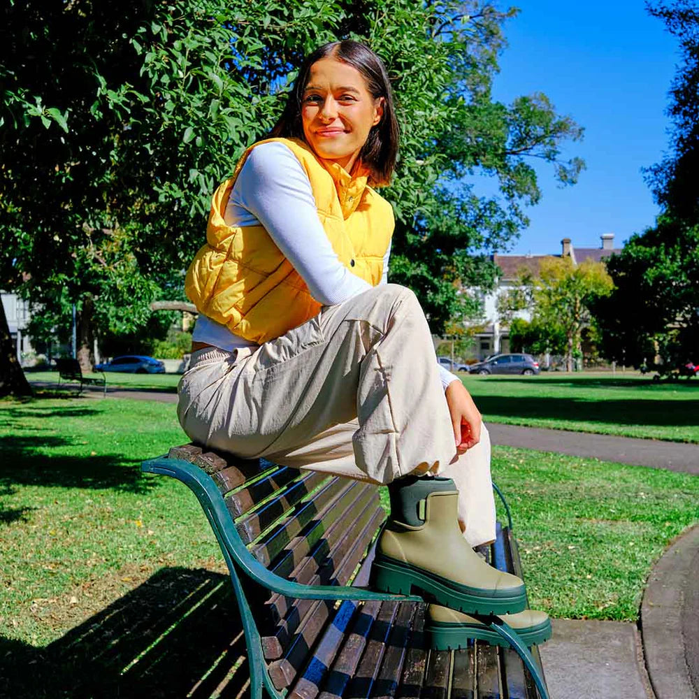 The Tully Boot’s distinct silhouette is a fashion forward take on the classic rain boot! Playful and urban; Tully nods to 90s nostalgia with a chunky platform-style sole and an extended, wrap around neoprene cuff.