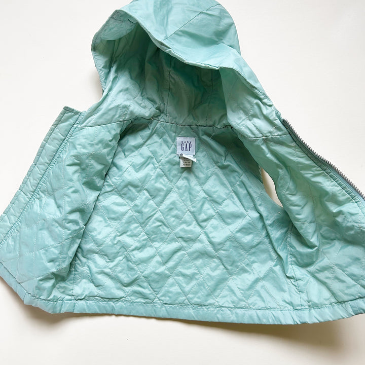 Vintage blue/green front-zip hooded vest from Gap. Late 90s. Good used condition with a few places on interior where thread is undone, but lots of life left. Size 3 -- please see measurements (13" length, 14.5" pit-to-pit).