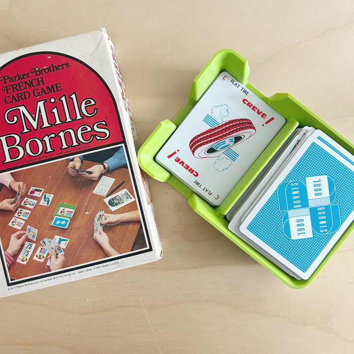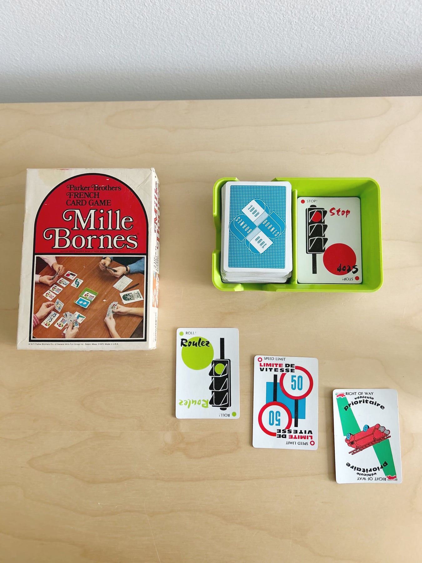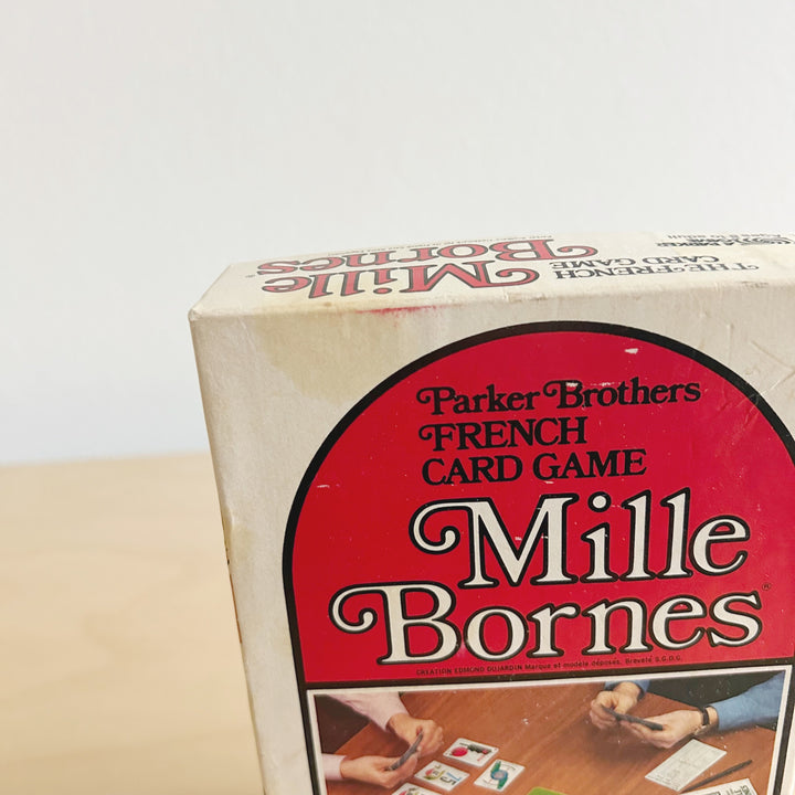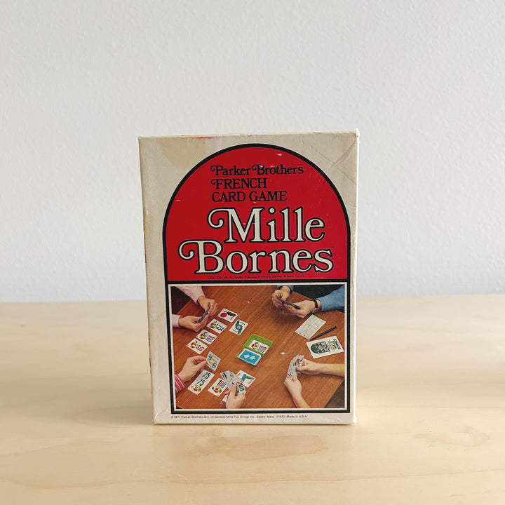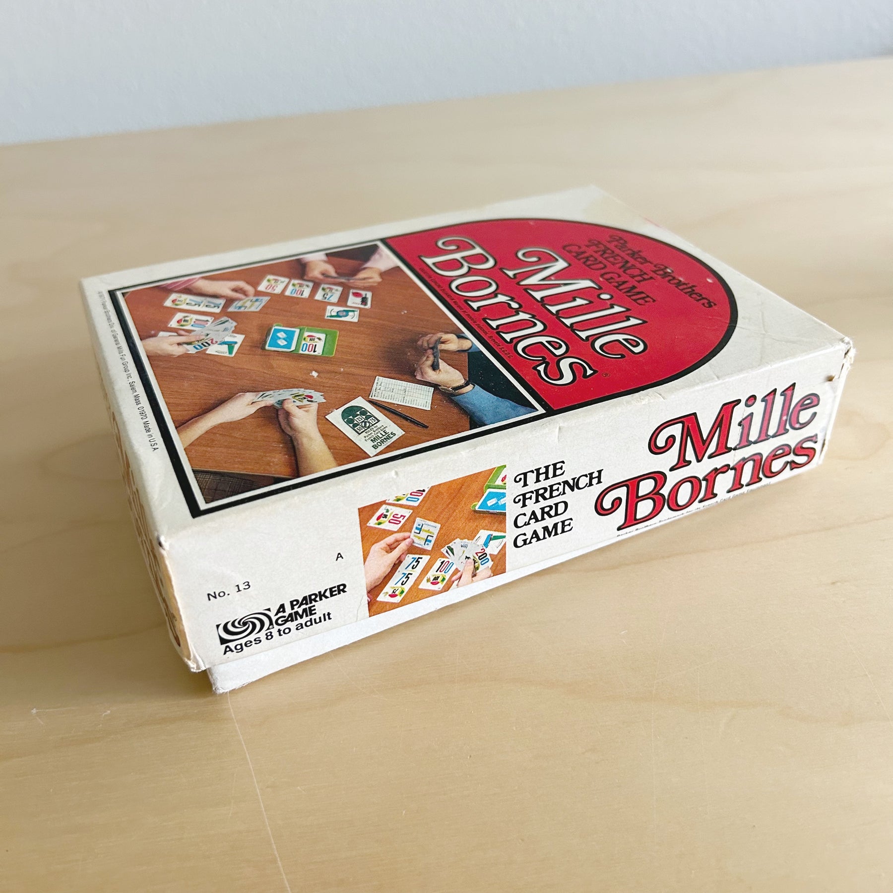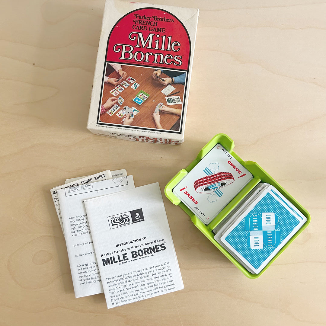 Vintage edition of Mille Bornes, the French card game, by Parker-Brothers. In good vintage condition. 106 cards, instructions, score sheet all included.