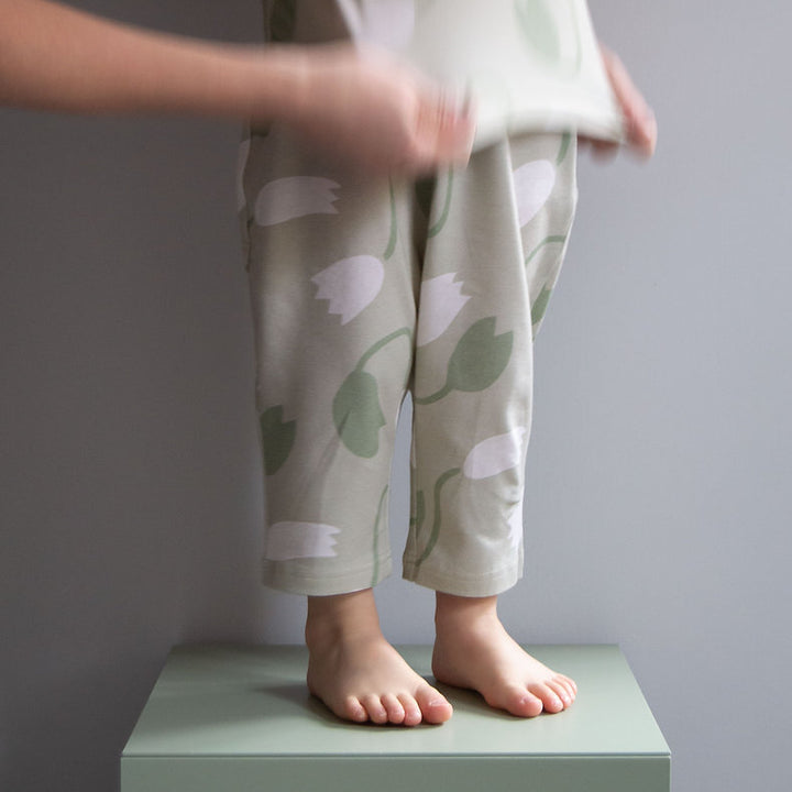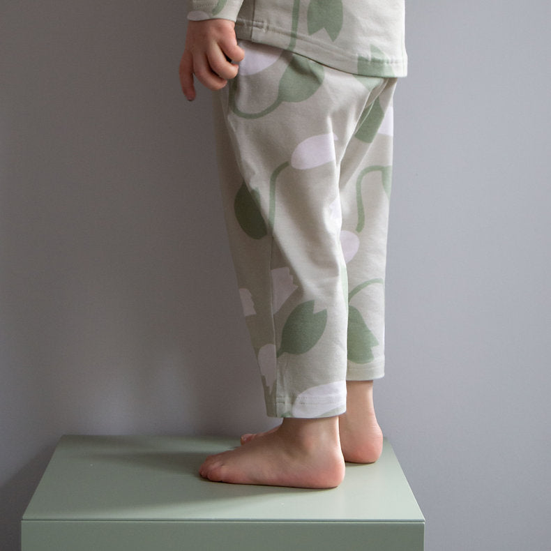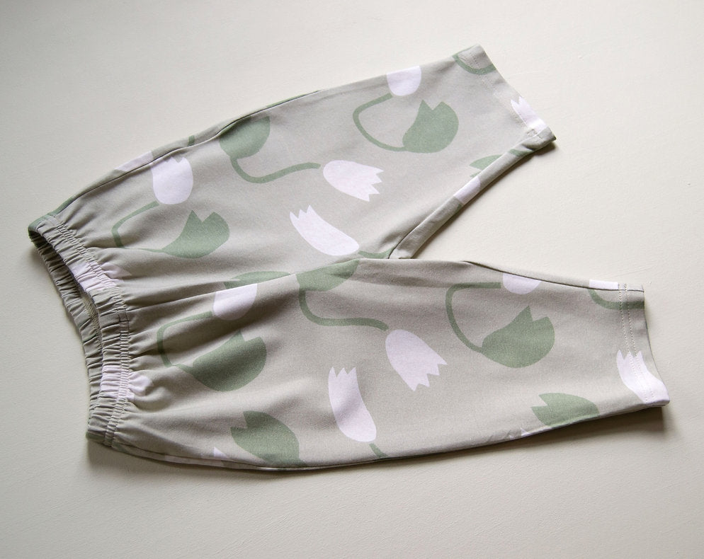 Loose and relaxed fit. Elastic on waist. Made from soft OEKO-TEX standard certified jersey material (free from any harmful chemicals).