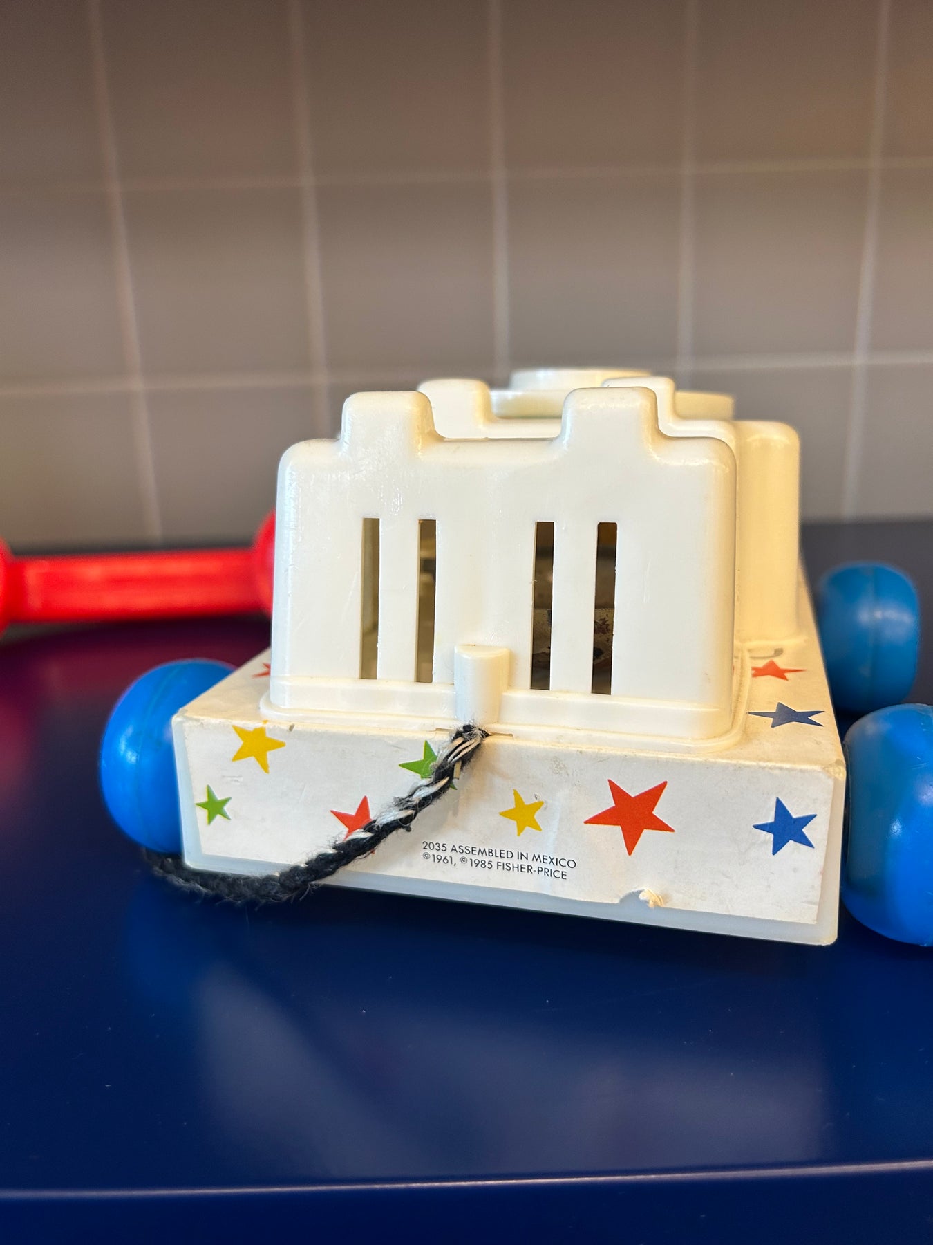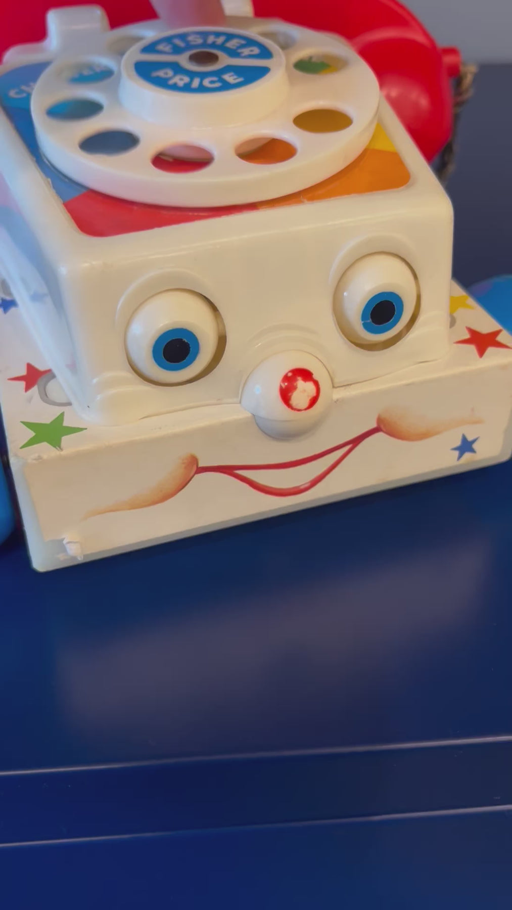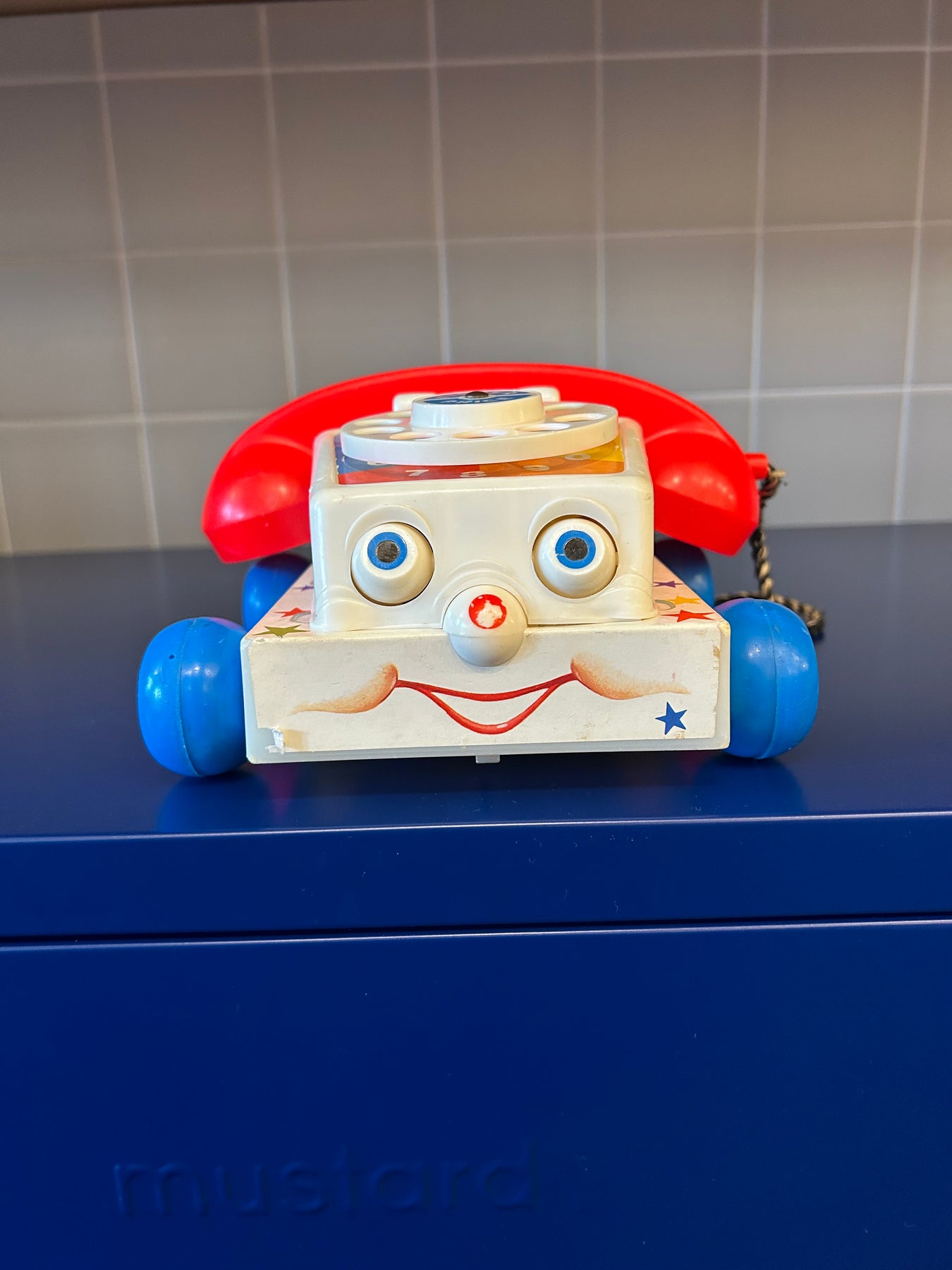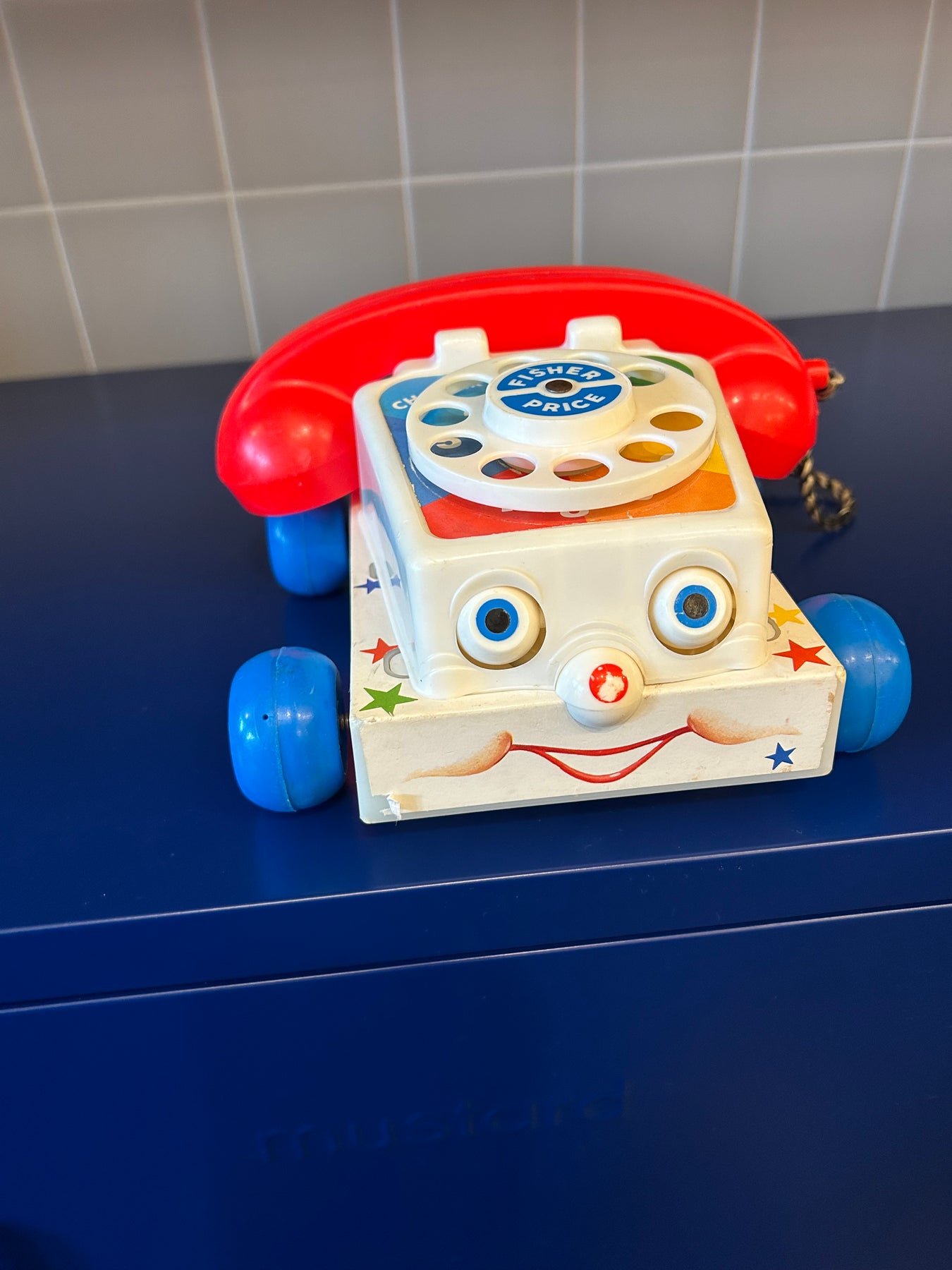 Cutest nostalgia or terrifying nightmare? Fisher Price Chatter Phone. Good vintage condition with some expected wear (notably fading on the nose, some wear to the paper).