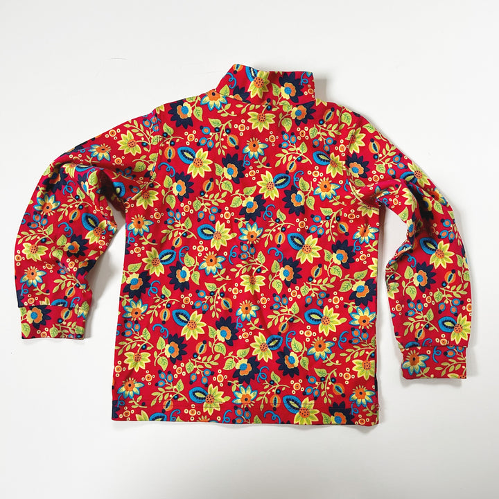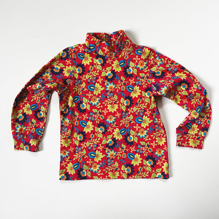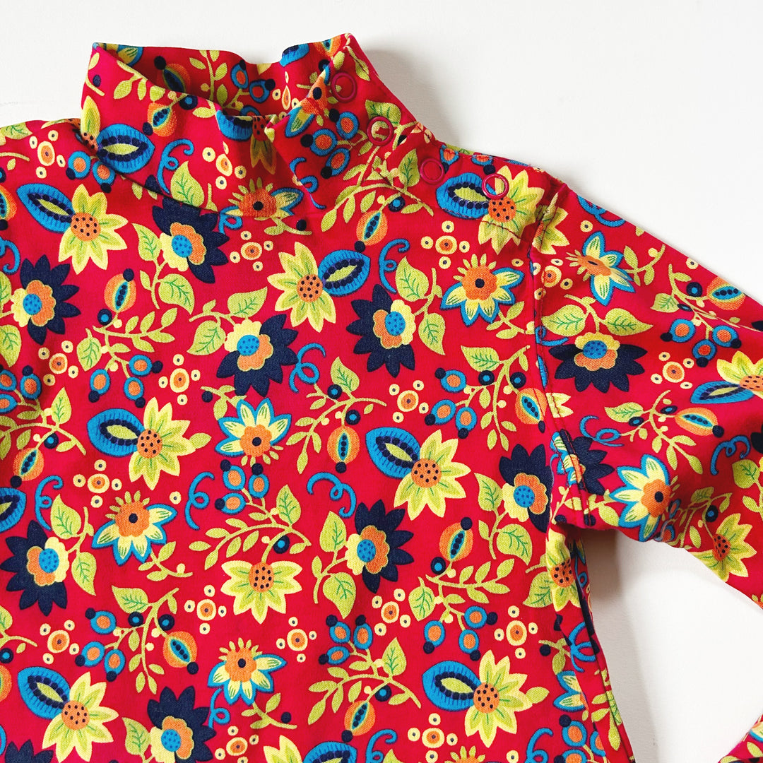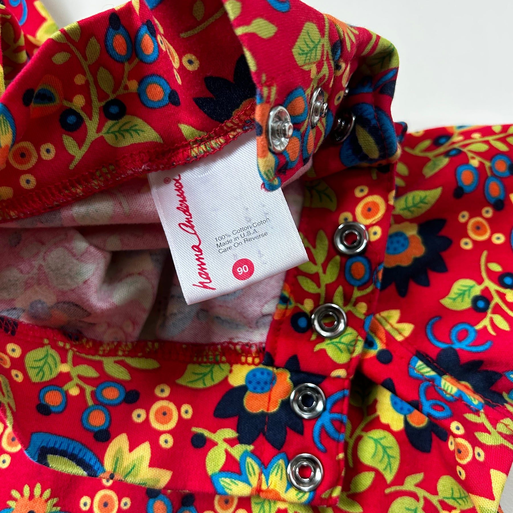 Vintage Hanna Andersson turtleneck. Red with bright multicolored floral pattern throughout. Snap neck for easy on/off.