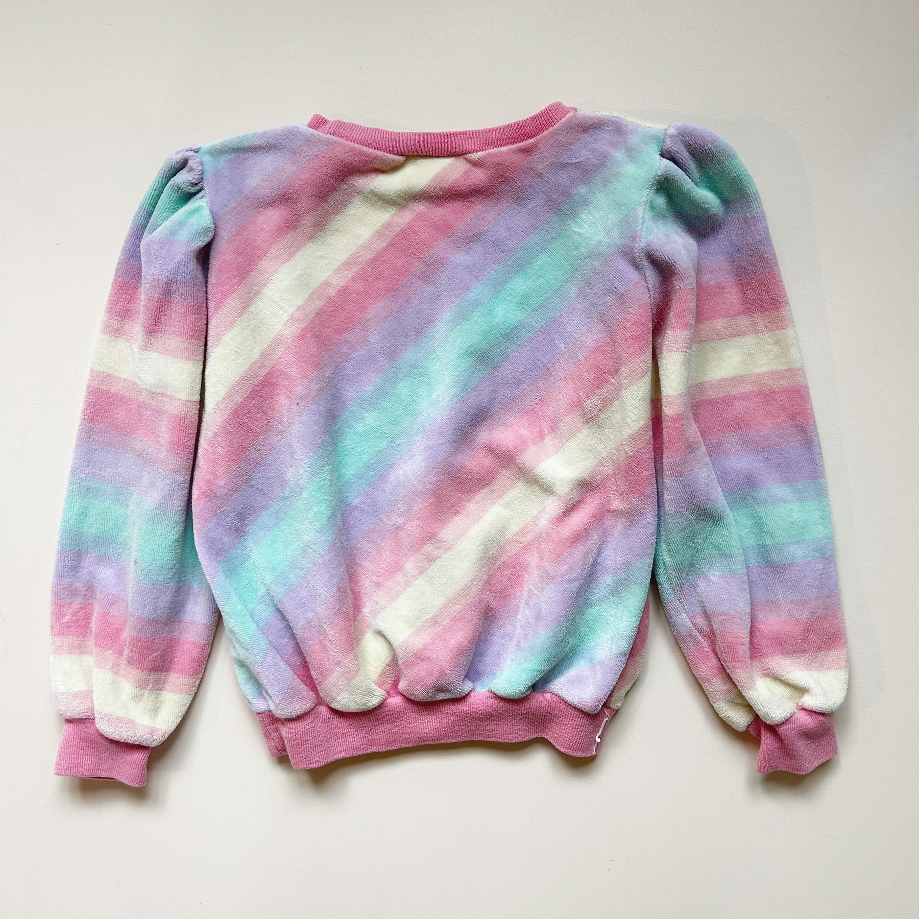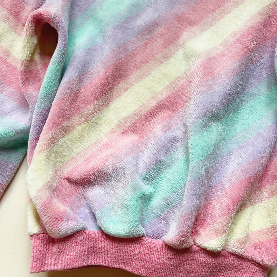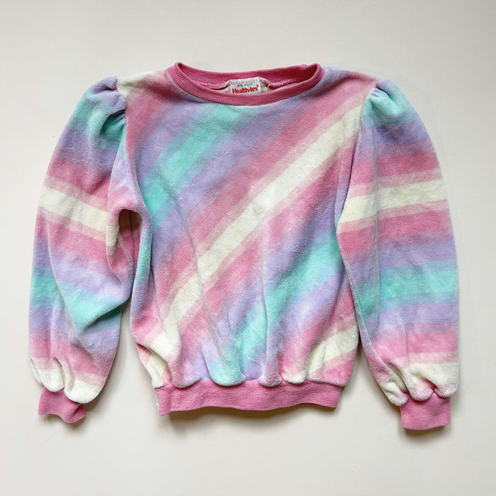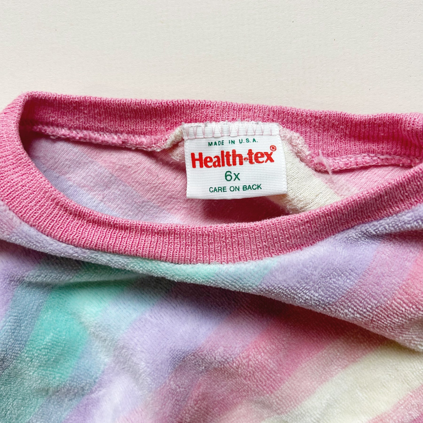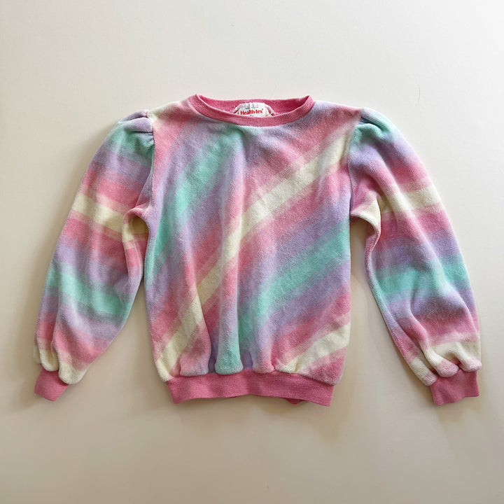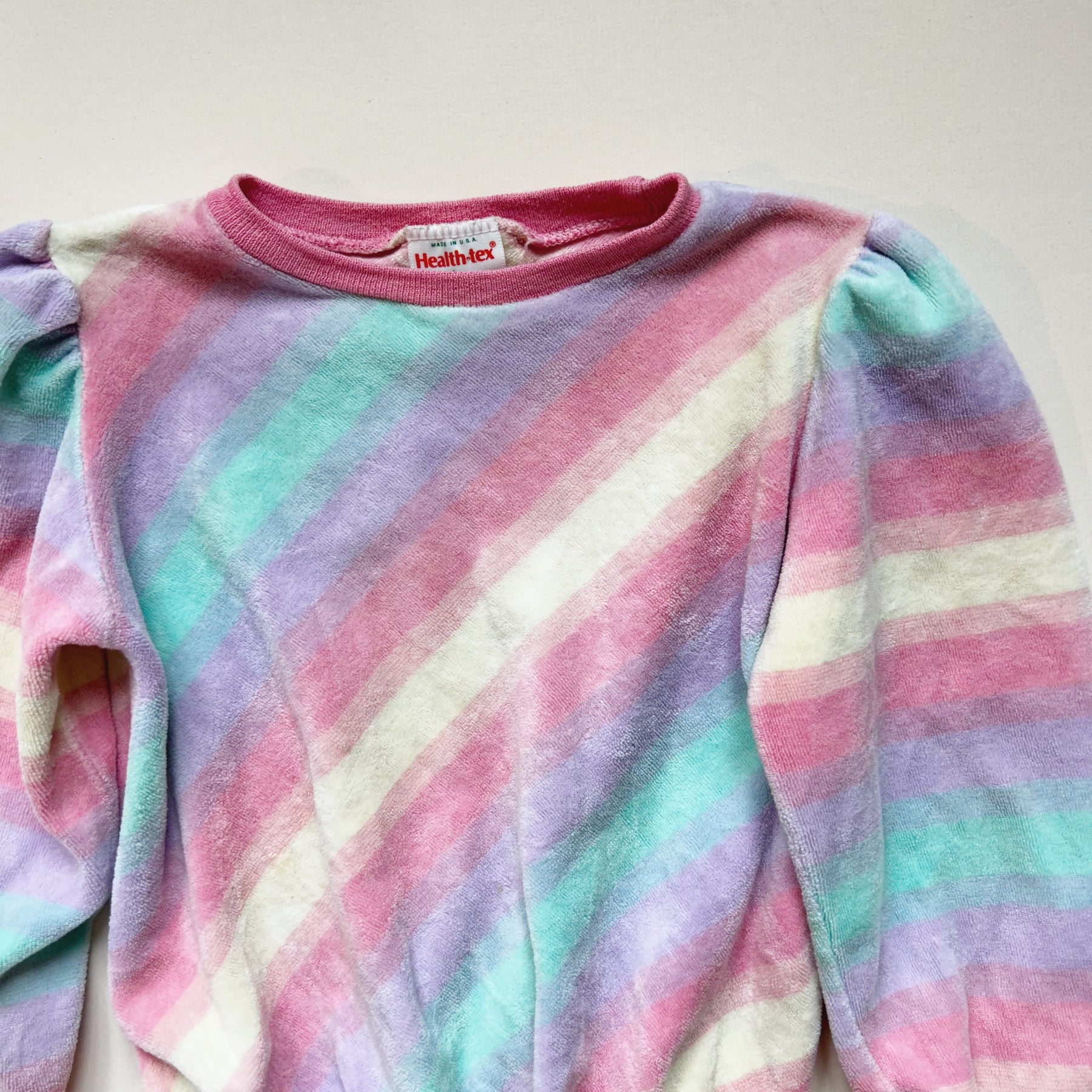 Vintage Healthtext velour long-sleeve top in pastel rainbow color way. Good vintage condition with light wear. Stated size 6 but more of a 4/5 -- please see measurements (15" length, 20" sleeve length)