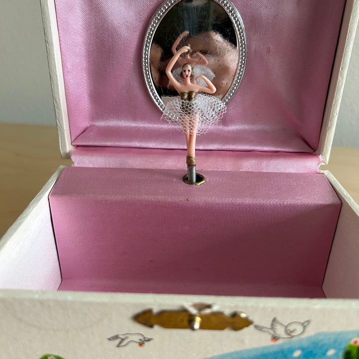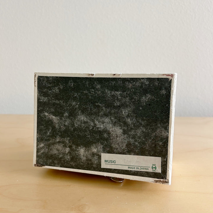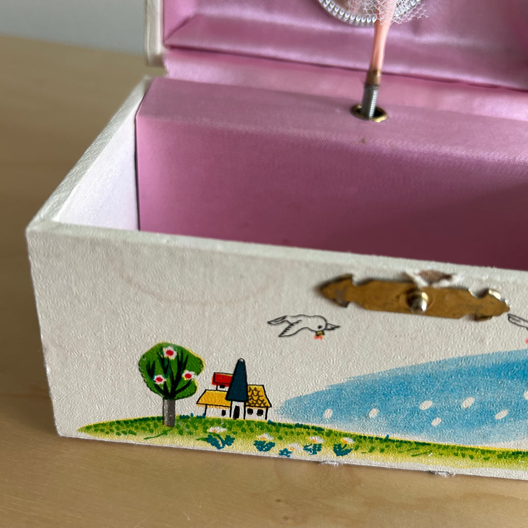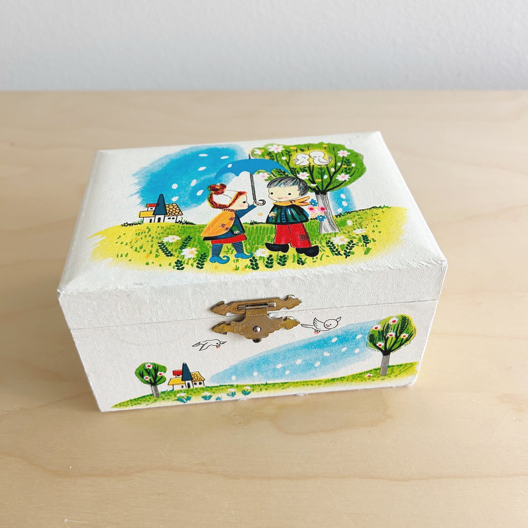 Vintage treasure / jewelry box with sweet child scene on exterior. Wind-up ballerina with mirror in interior. Made in Japan. Vintage condition: mirror has some wear, ballerina spins but music plays slowly, and a few places of discoloration on inside. Nostalgia in a box!