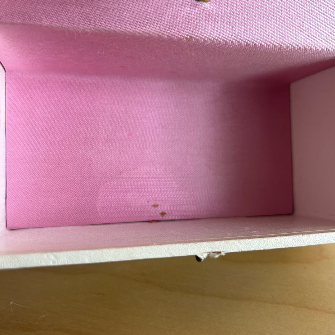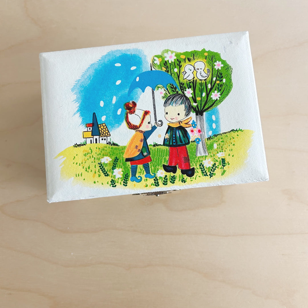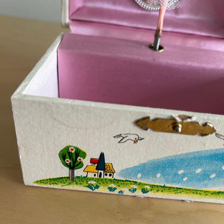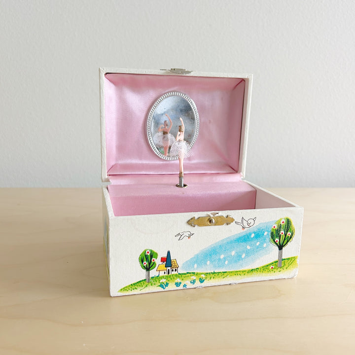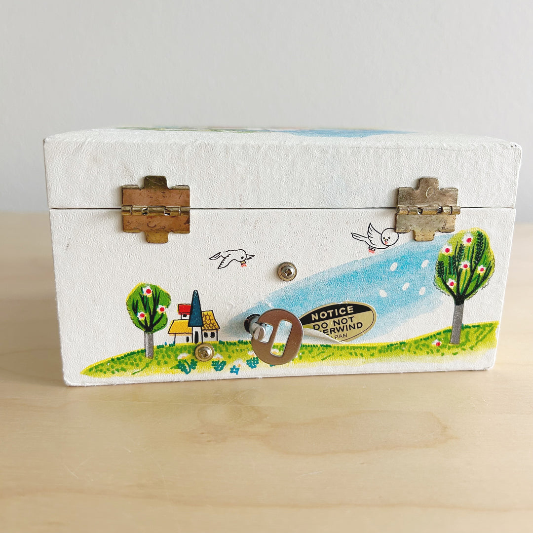 Vintage treasure / jewelry box with sweet child scene on exterior. Wind-up ballerina with mirror in interior. Made in Japan. Vintage condition: mirror has some wear, ballerina spins but music plays slowly, and a few places of discoloration on inside. Nostalgia in a box!