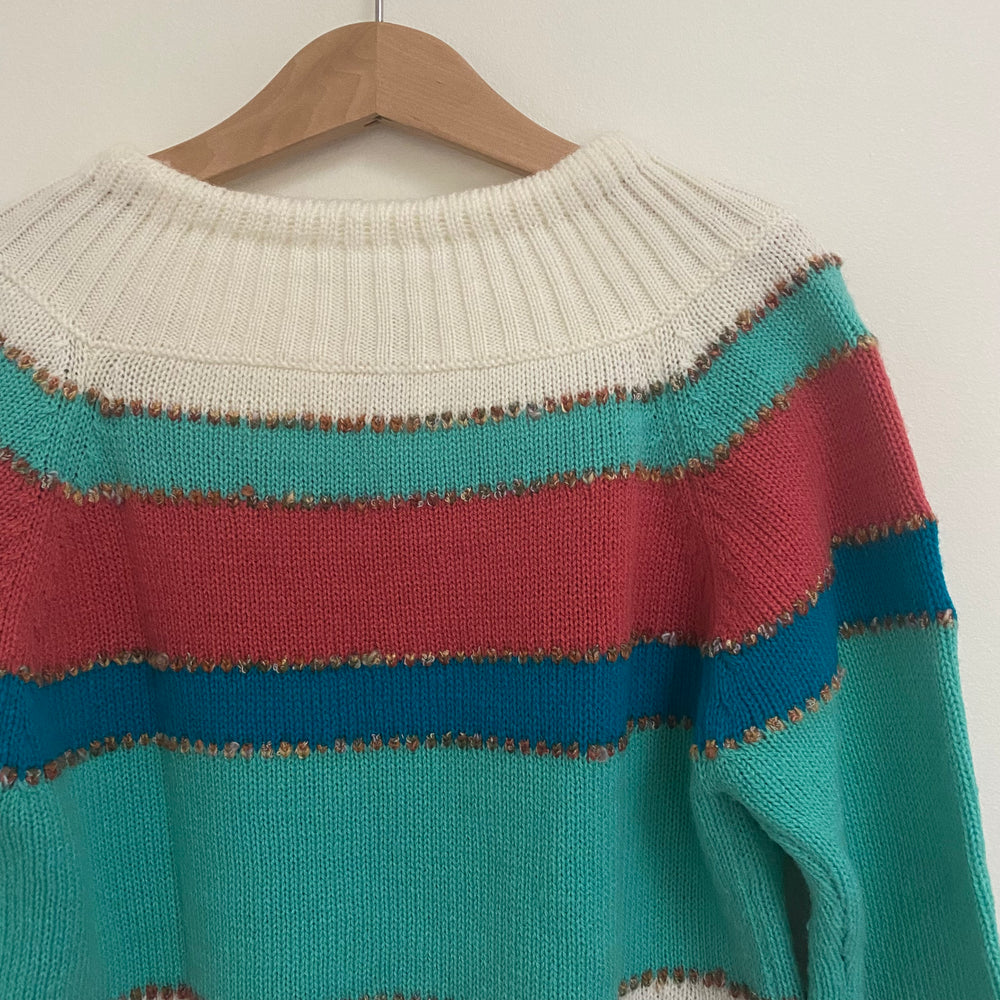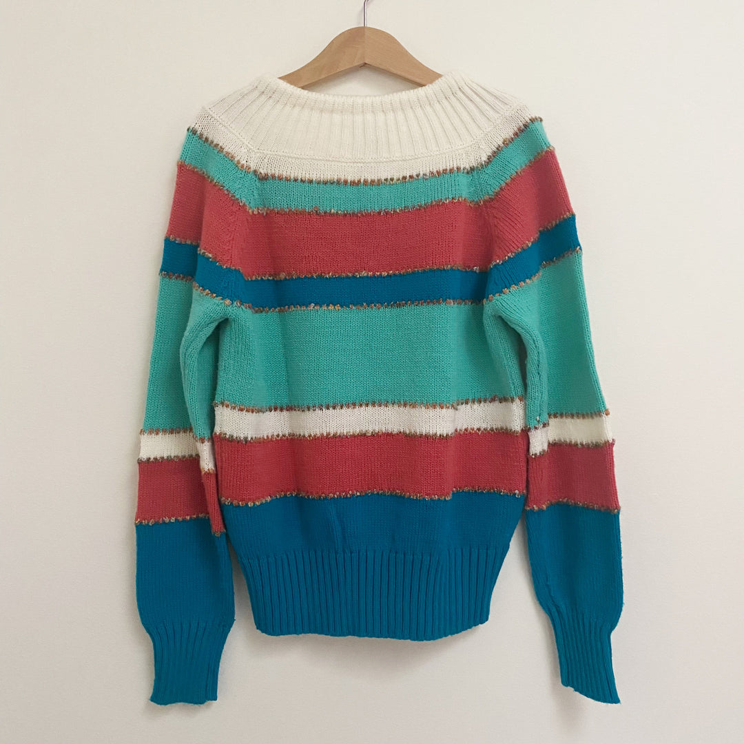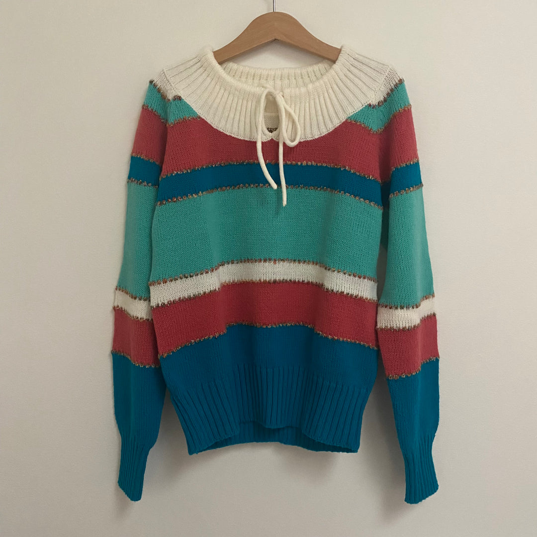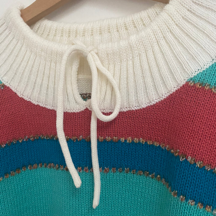 Vintage striped sweater with tie back. Acrylic. Approx size 8/9 -- please check measurements and more are available upon request (20" length and 15.5" pit-to-pit). Good vintage condition with some expected wear. Love these colors!