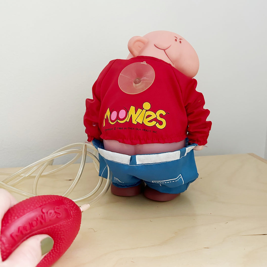 Get your 1980s inappropriate humor on with the vintage Moonies character. Pants come down to reveal tush when squeeze ball squeezed. Good used condition -- mooning still works. Gag gift galore.