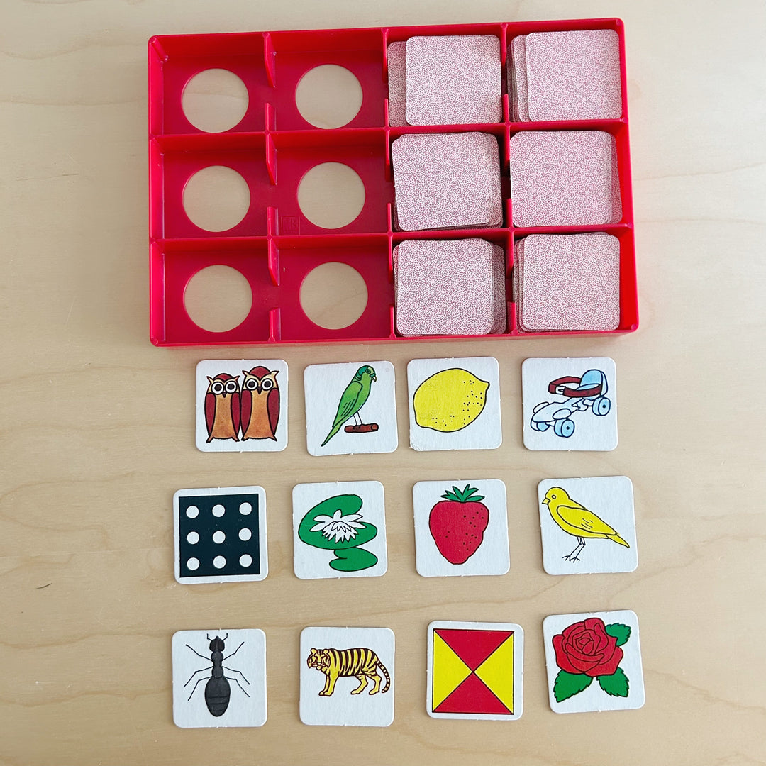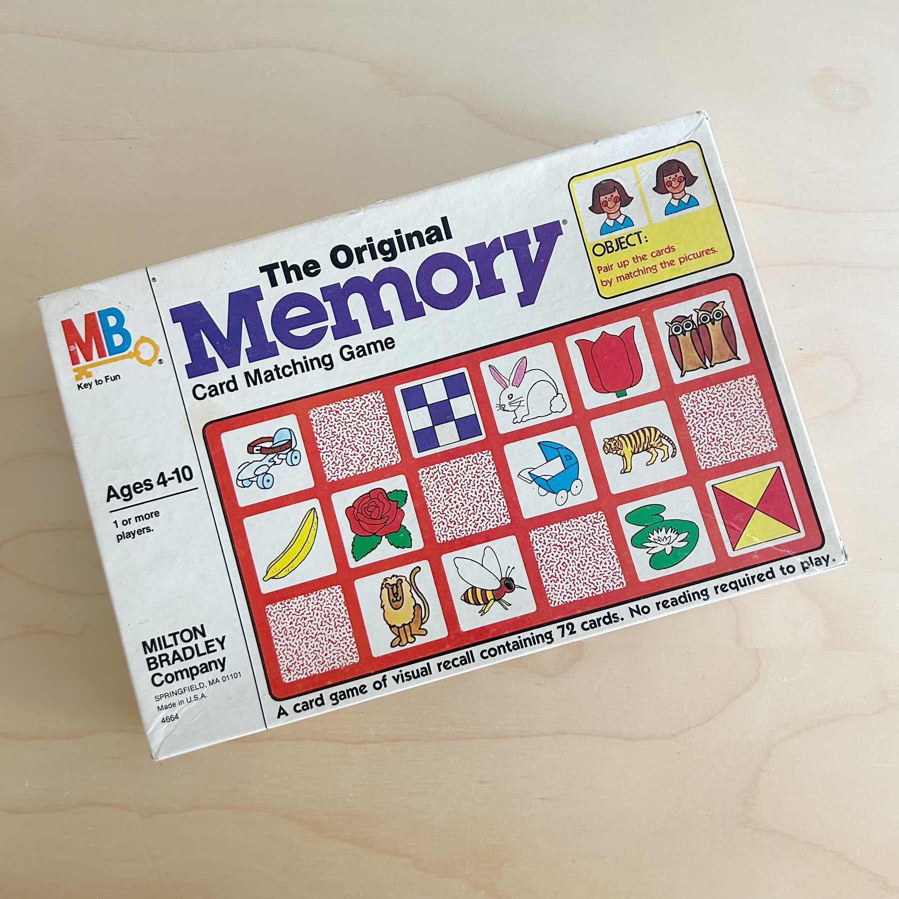 The original Memory card matching game from Milton Bradley! Vintage 1980s edition of this nostalgia game. Complete set (72 cards total) in good vintage condition, with one card with a bend (see image)