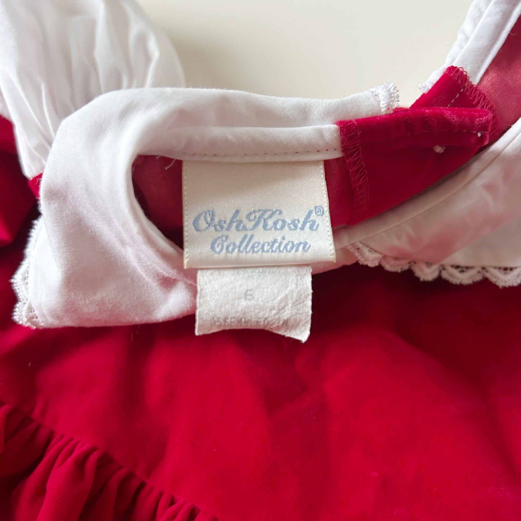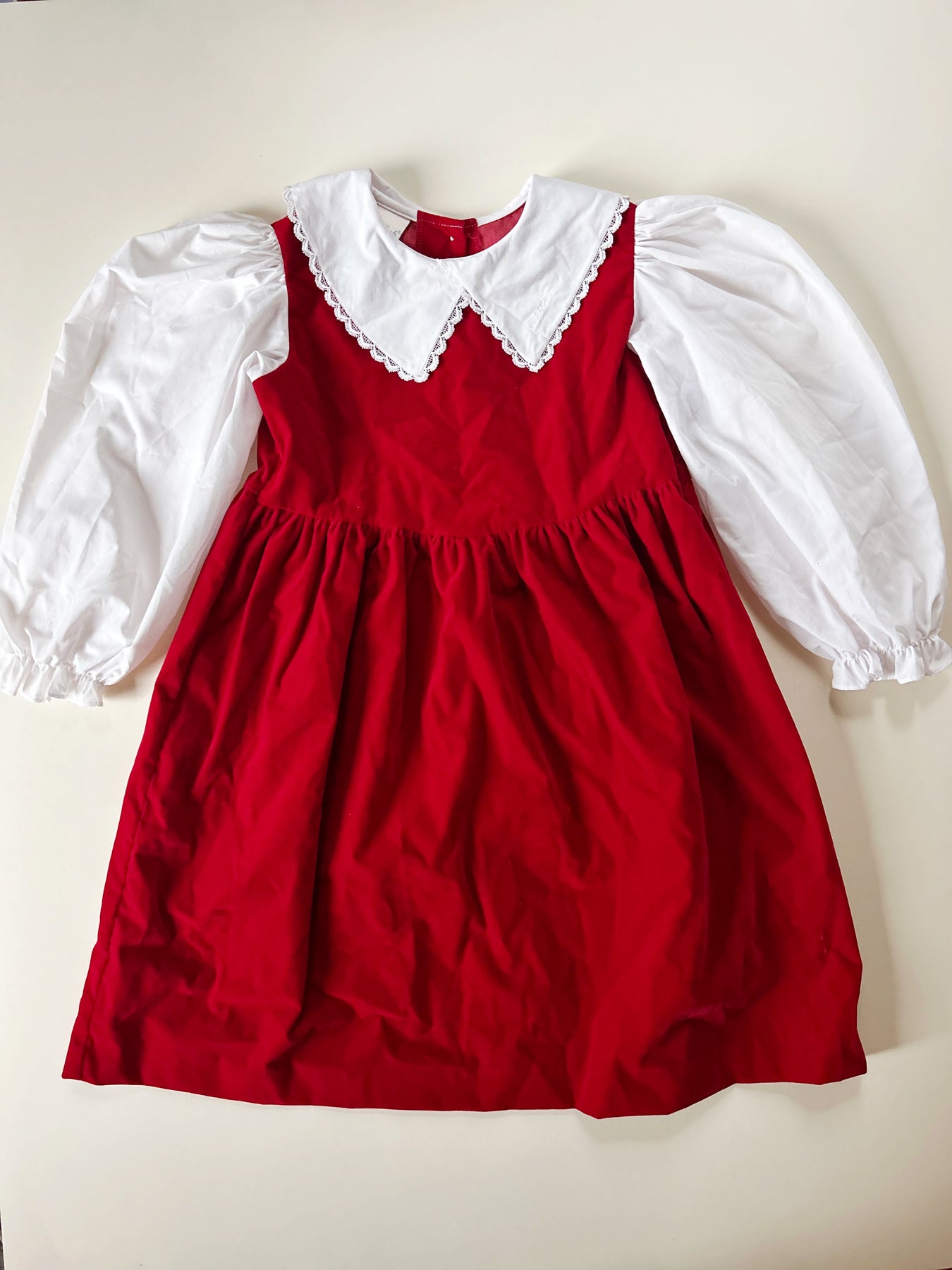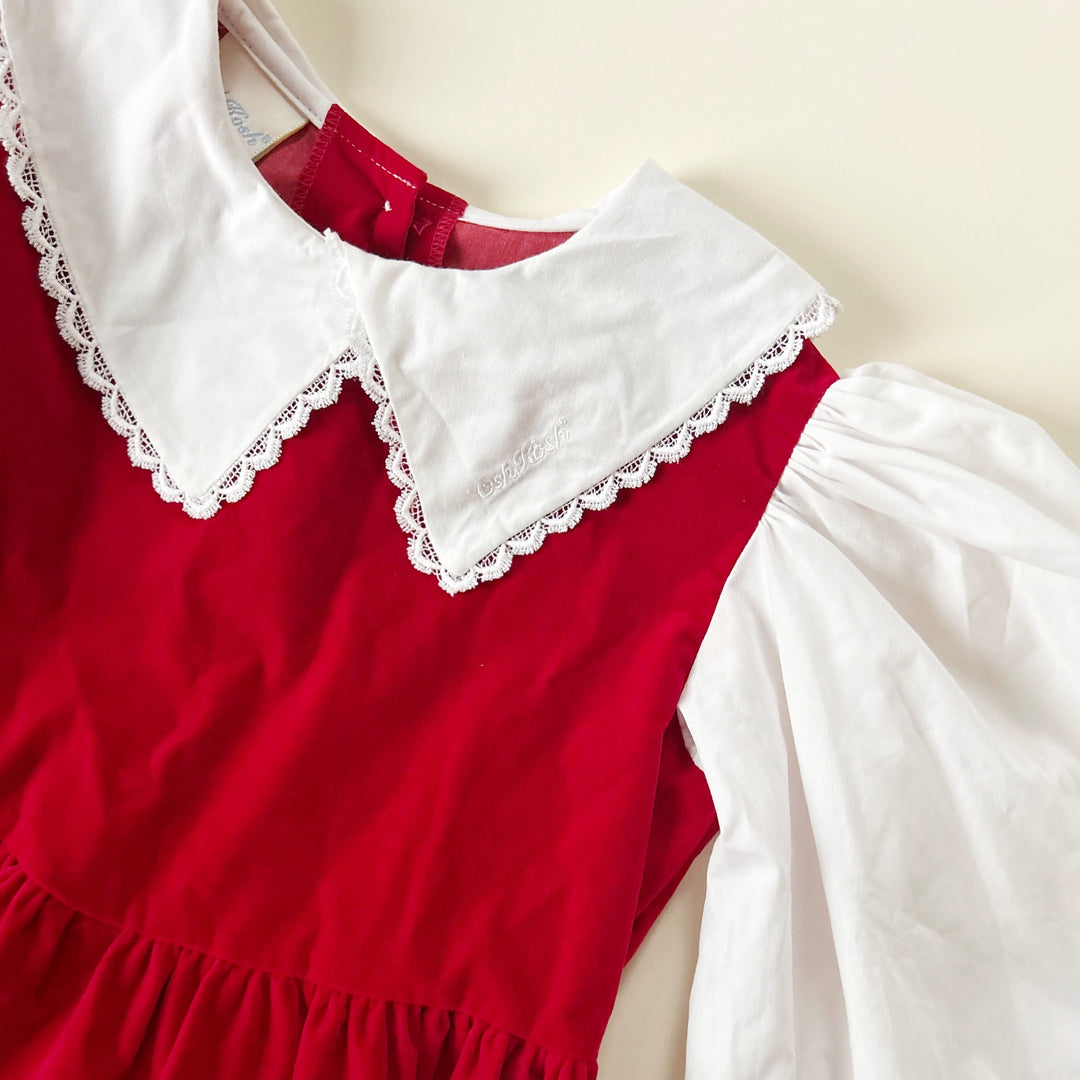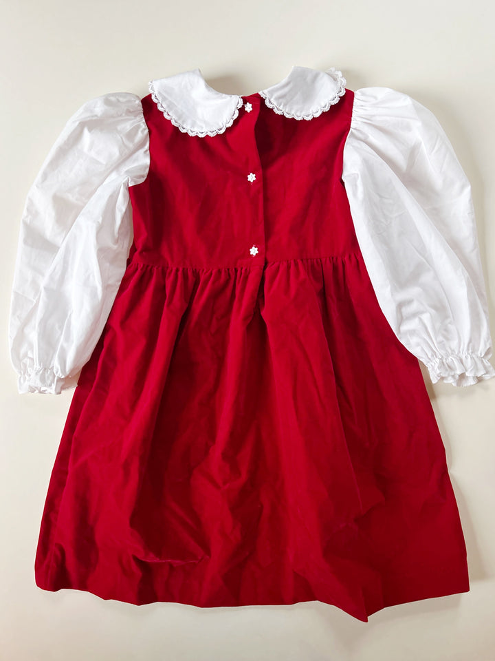 Vintage red velvet dress from OshKosh with puff sleeve blouse attached. Button back. Good vintage condition with light wear. Nylon/cotton/poly blend. Size 6 -- please see measurements (27" length, 19" sleeve length).