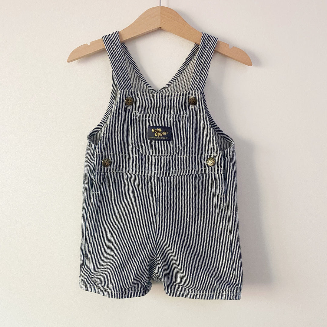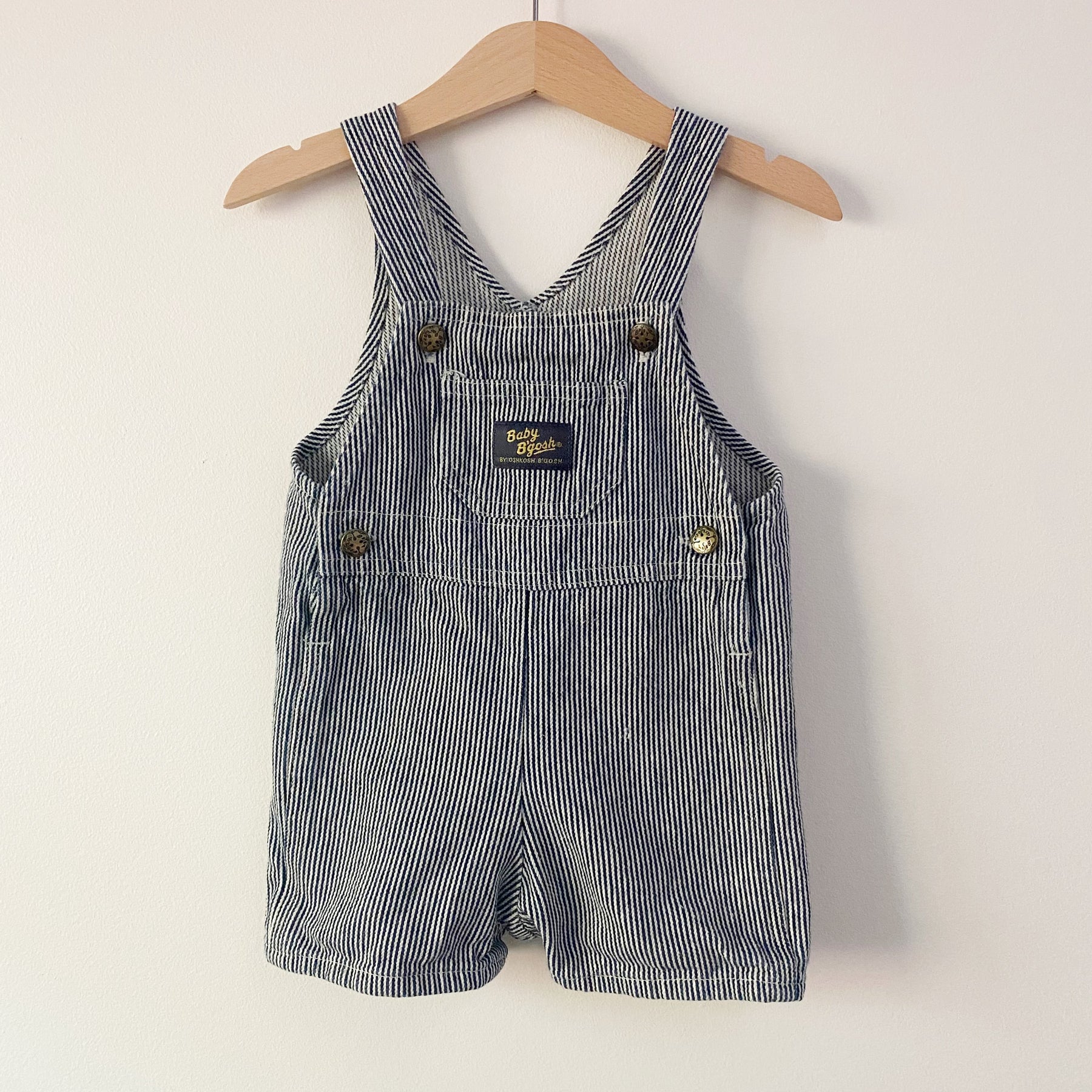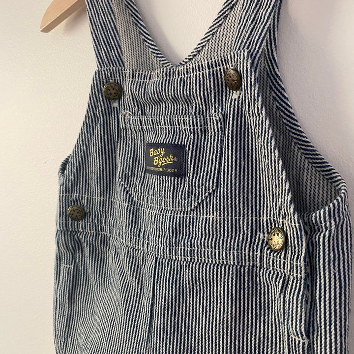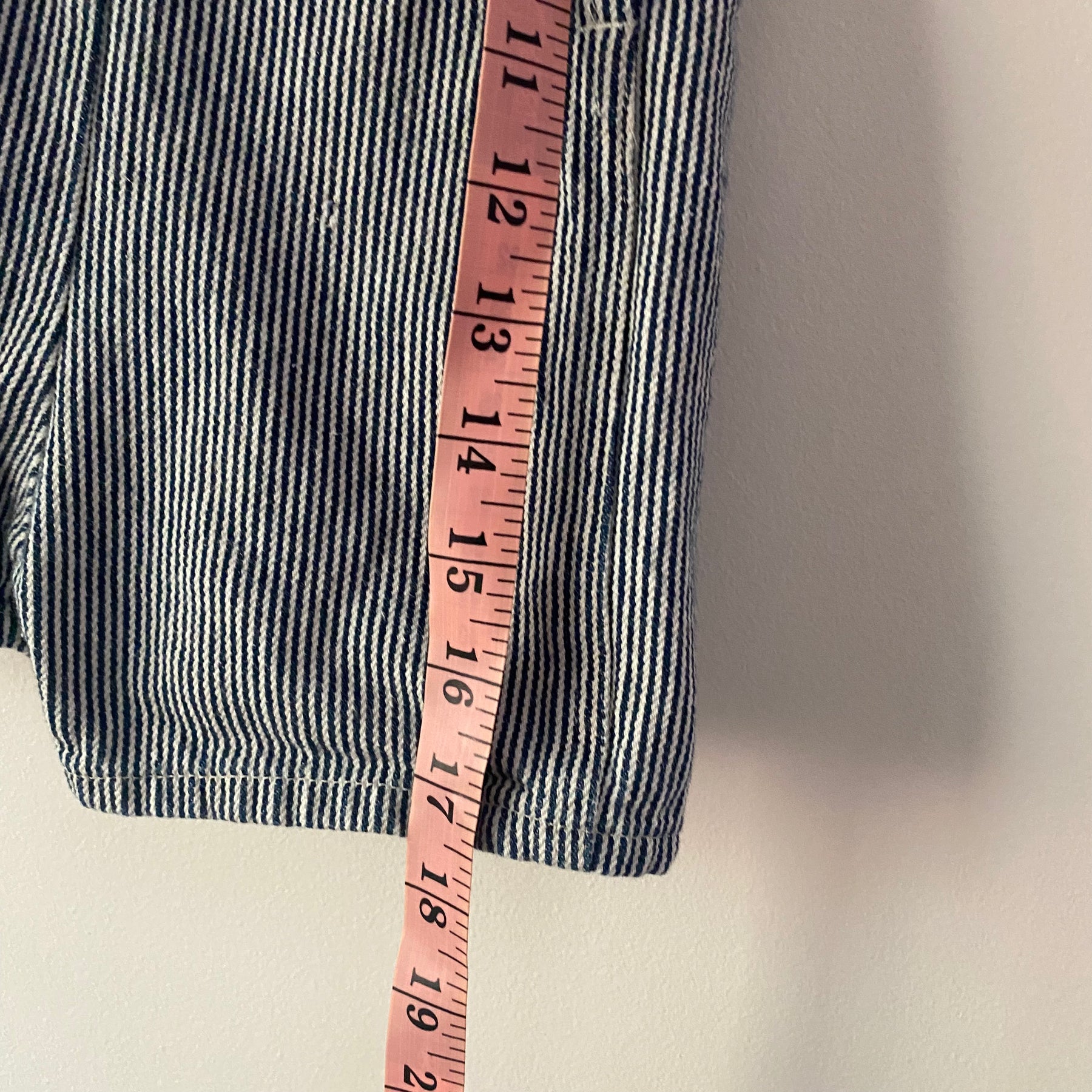 Vintage OshKosh engineer stripe shortall overalls. Size 18 mo (17.5" length at longest). Good vintage condition for some expected wear.