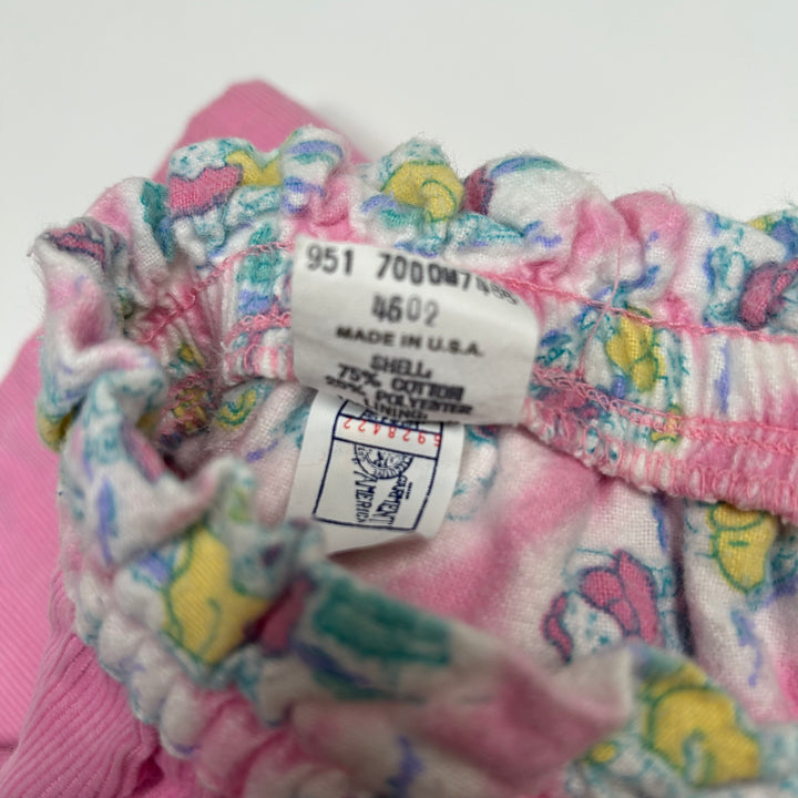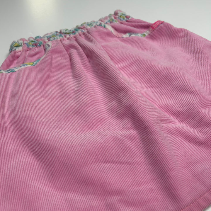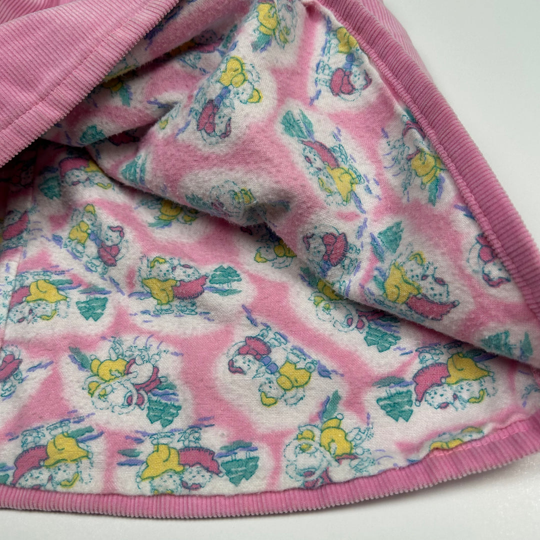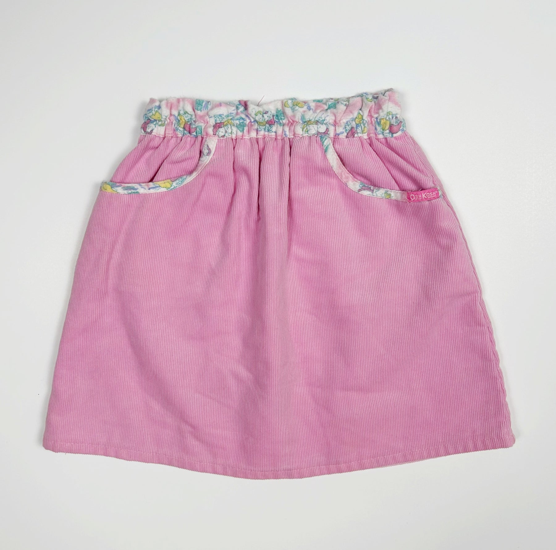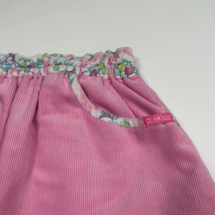 Vintage pink corduroy OshKosh skirt with bear pattern accent on waist, pockets, and as lining. Size 6 (around 14" length) with elastic waist. Good vintage condition with some expected wear. Made in USA/union made
