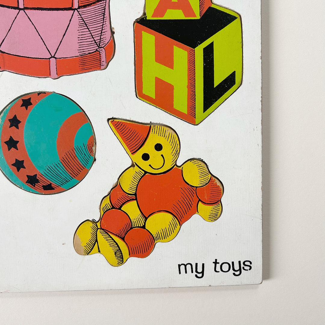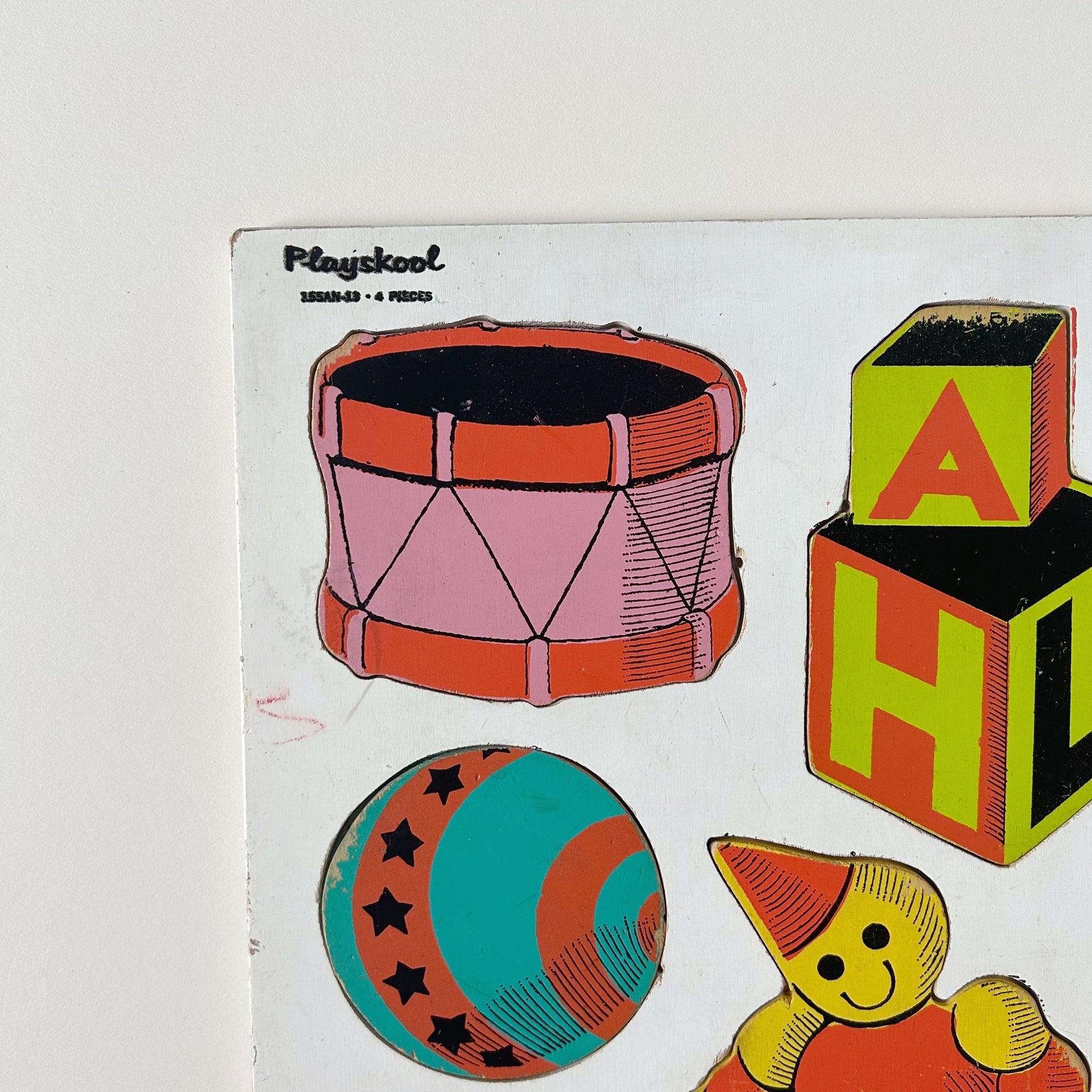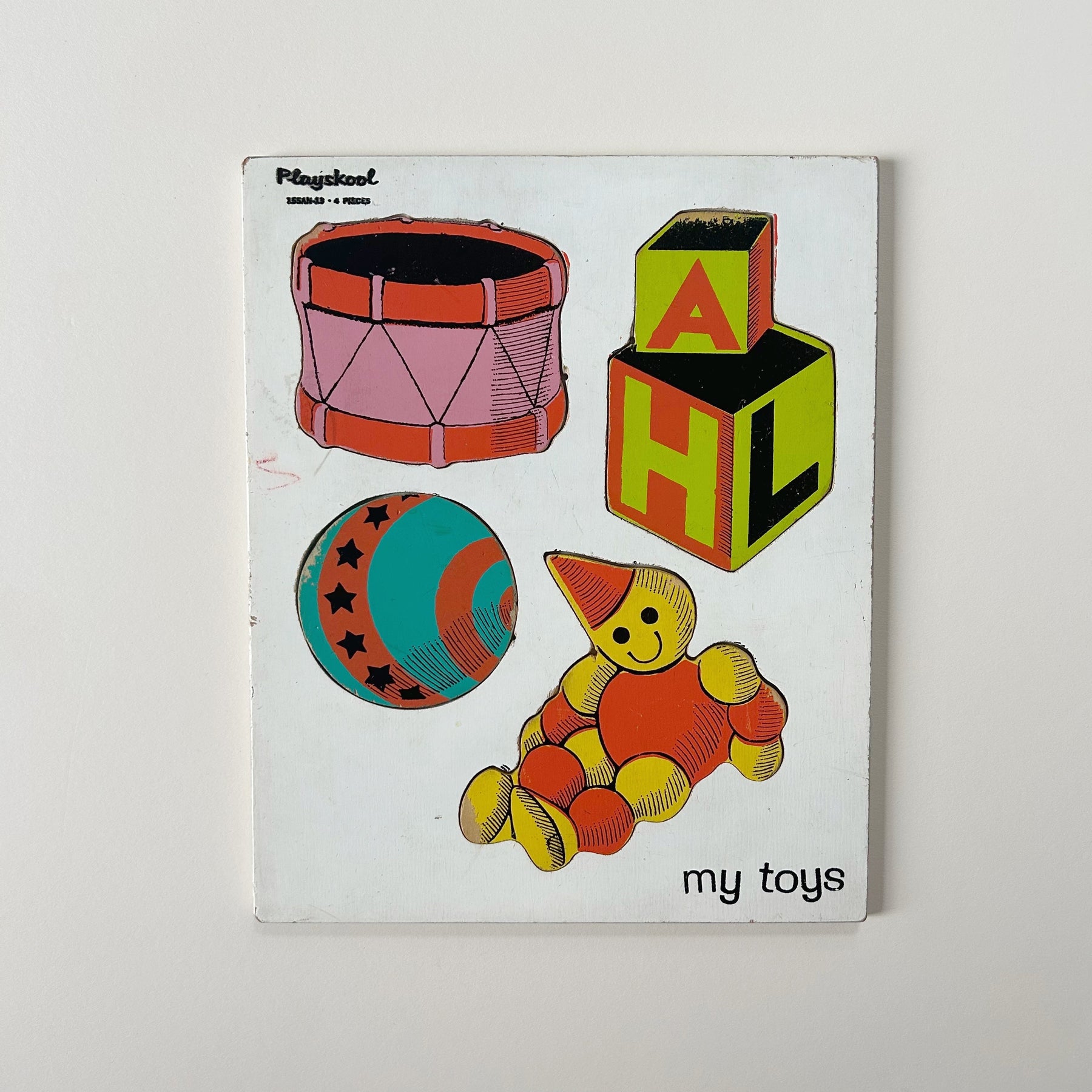 Vintage wooden puzzle from Playskool titled "My Toys" with four toy pieces. Such a sweet decor item for any nursery or play room. Vintage condition with some wear and discolorations on the puzzle (see images for details).