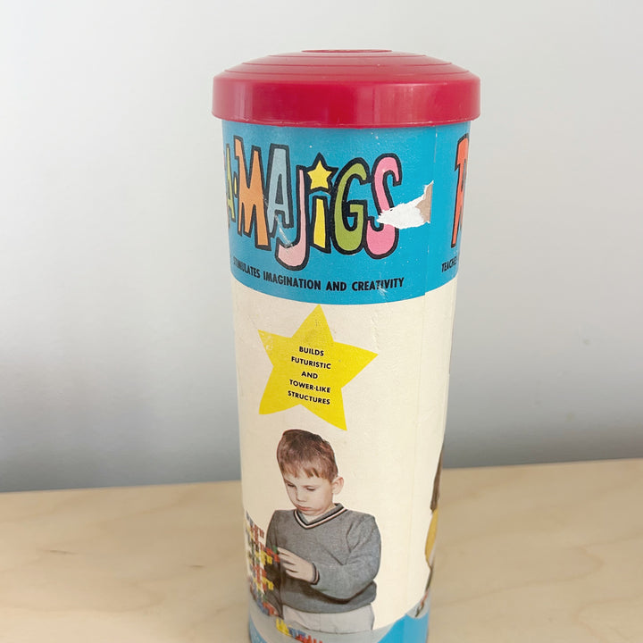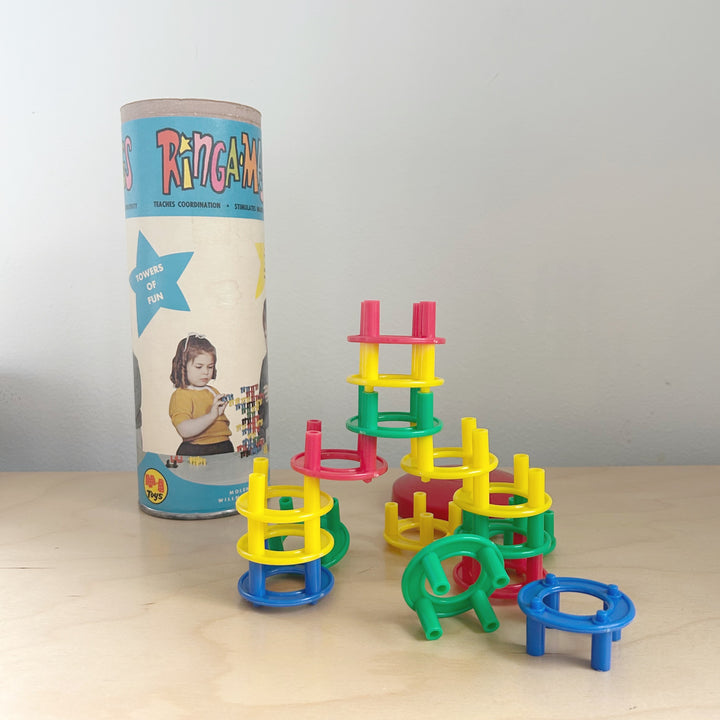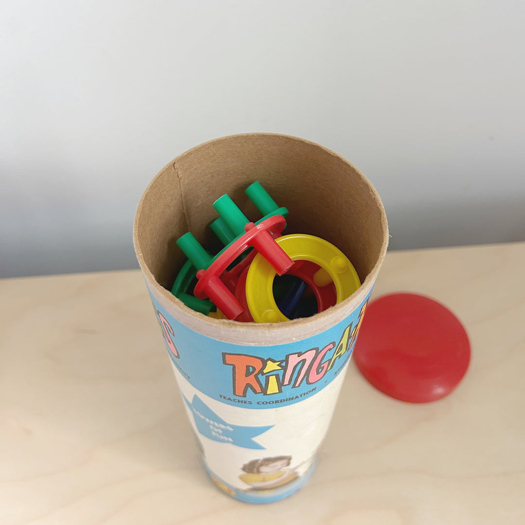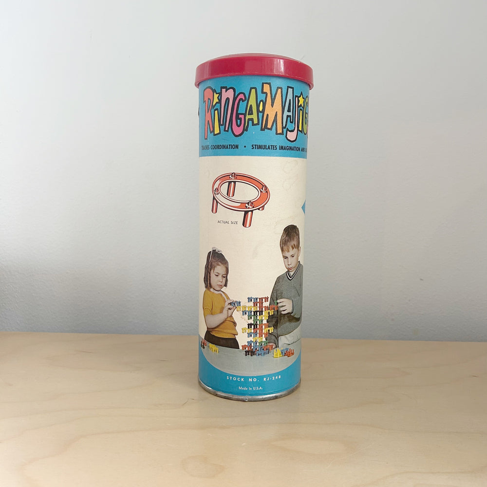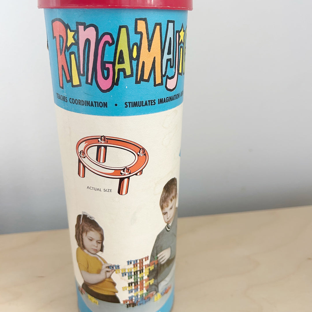 Vintage Ringa-Majigs, a vibrant heavy-duty plastic construction toy. Recommended ages 3 and up. Comes in cylindrical cardboard container with original label. Some wear to the label but toys in great condition. Fun and satisfying to play with and container makes great display piece.