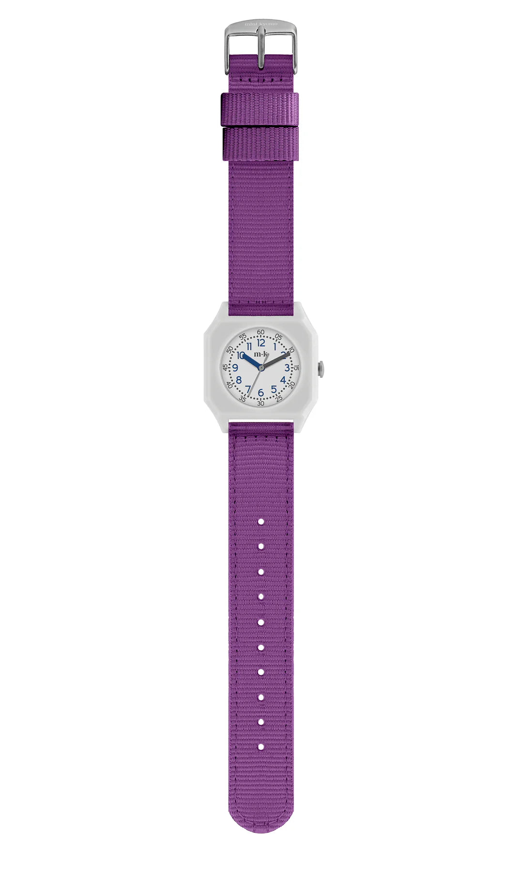 The watch has clearly readable dials with strong color contrast to make learning to read time an easy task. All hours and five-minute steps are written out, the minutes in-between are marked with small dots.
