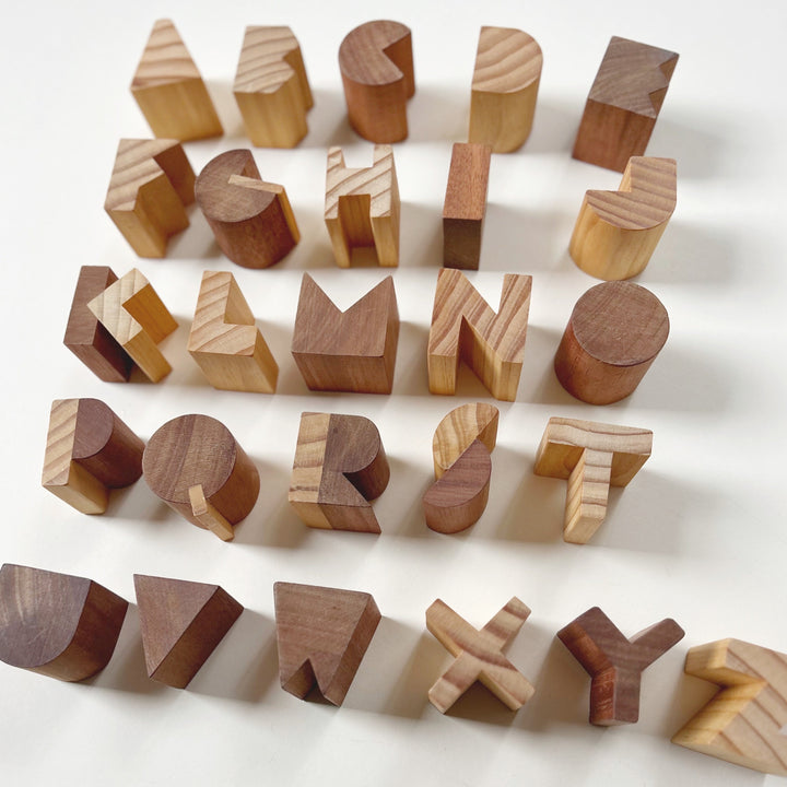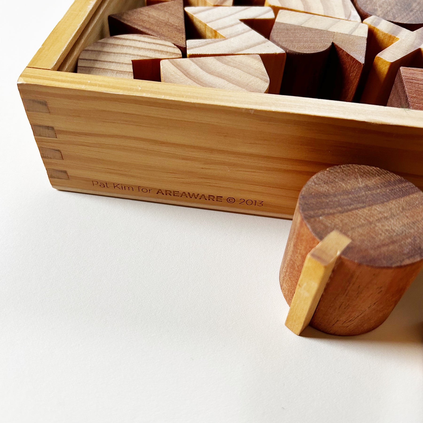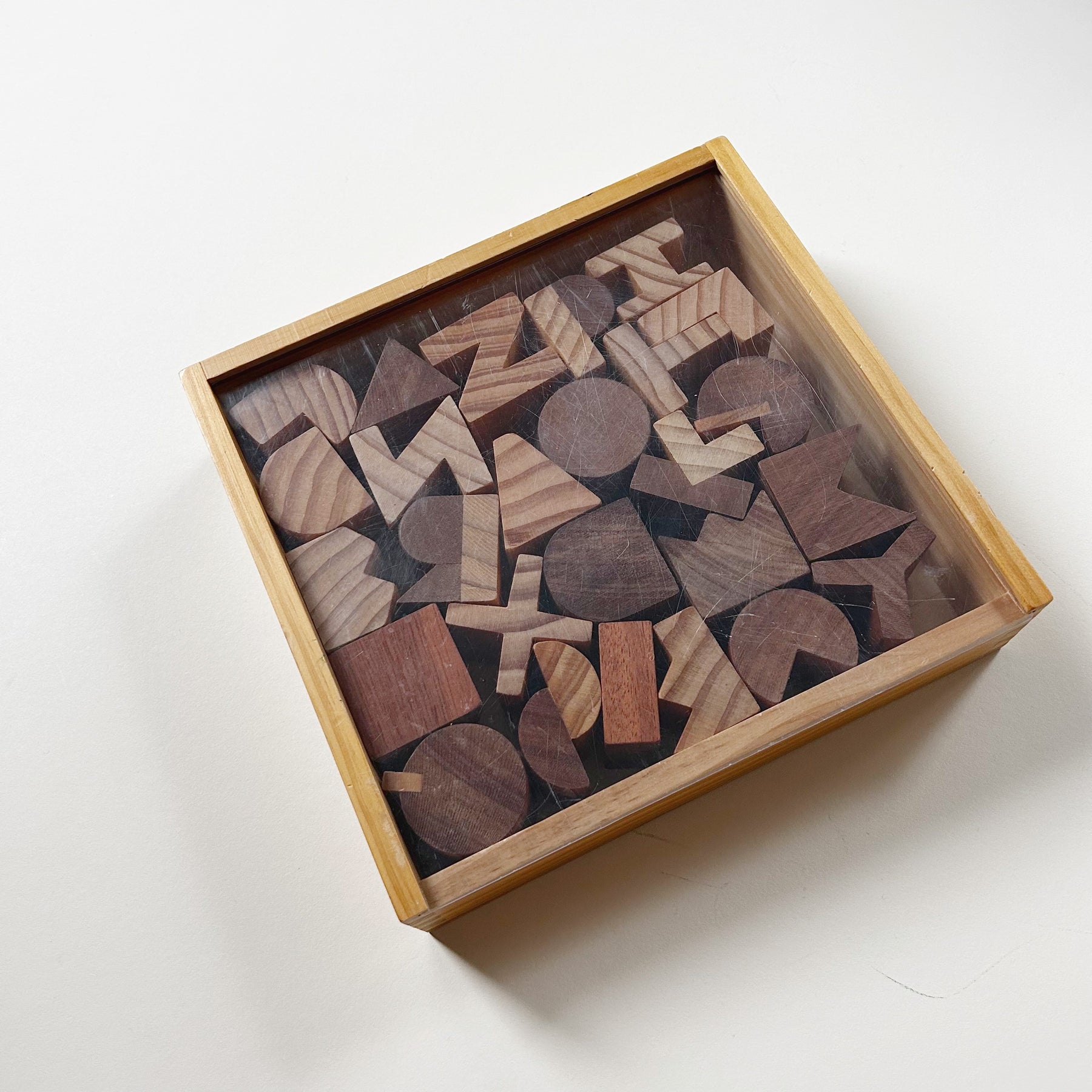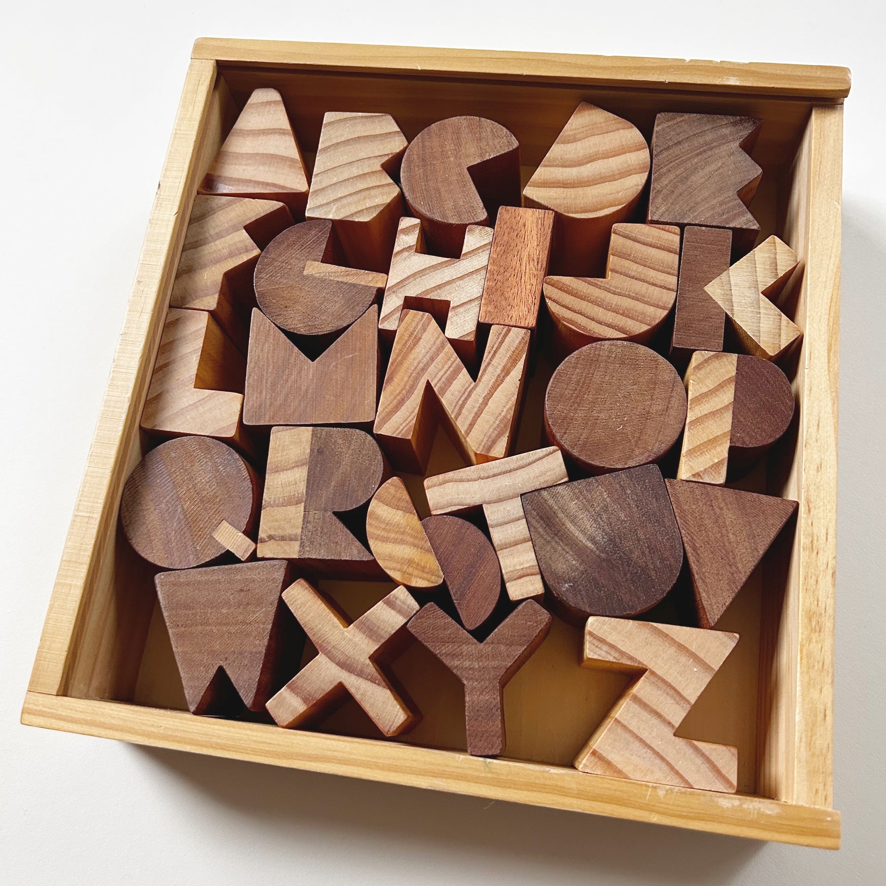 Wooden alphabet from Areaware. 26 stackable letters made of mahogany and pine wood. Designed by Pat Kim for Areaware. Good used condition with light wear -- plastic covering for box has some scratching but wooden letters are in great shape.