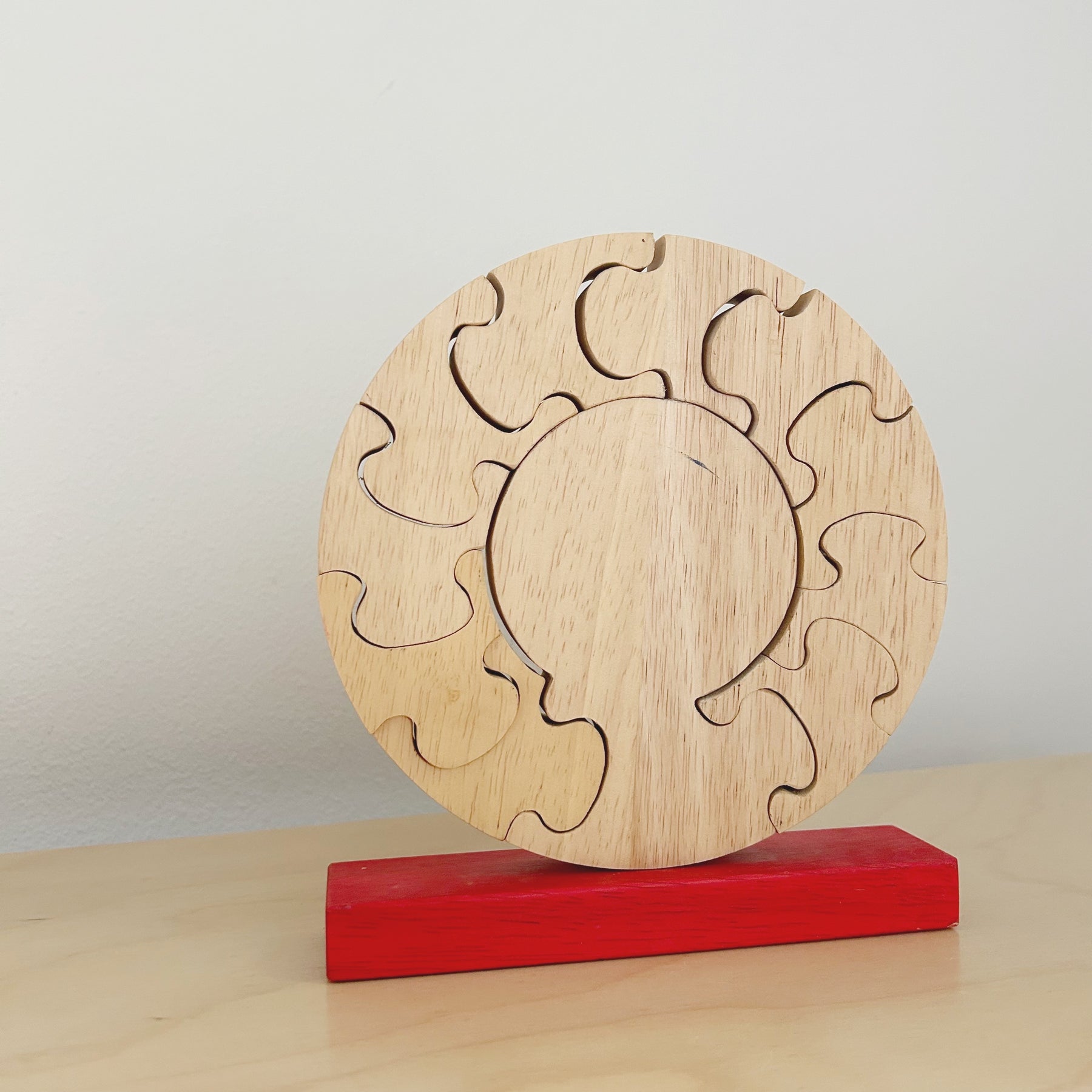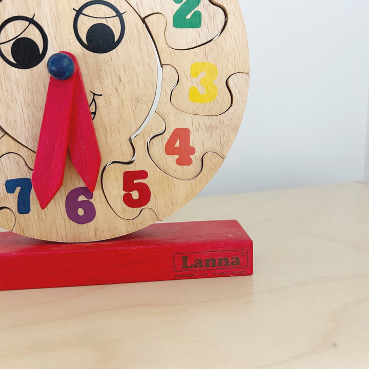 Wooden clock puzzle from Thailand. Clock face with movable hour and minute hands and removable number pieces. Good used condition.