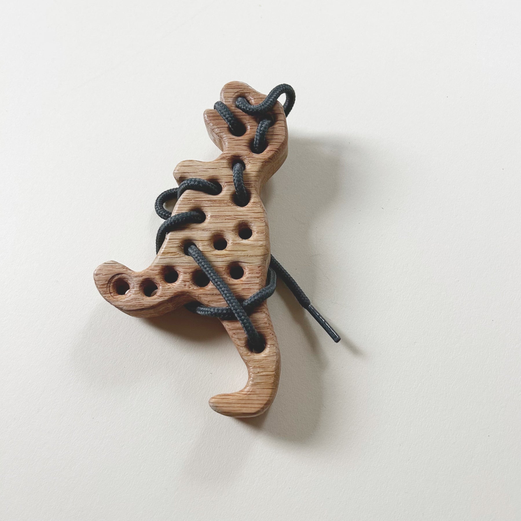 Wooden dinosaur lacing toy. Very good used condition with light wear. Great for practicing fine motor skills with lacing and tying!